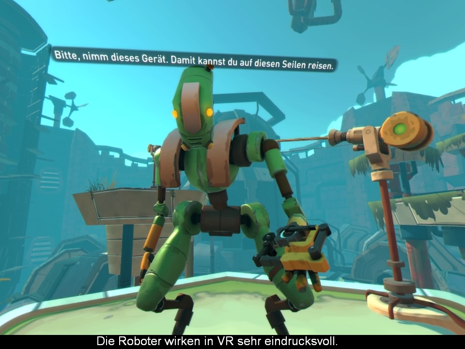 Das wundervolle an Wayward Sky ist allerdings die Präsentation. Die Grafik kommt mit schönen Pastellfarben daher und bietet einen extrem plastischen Look. Die Figuren glaubt man fast anfassen zu können und wirken wie kleine Actionfiguren. Auch die Festung an sich schaut gut aus und bietet in der Spielzeit optisch genug Abwechslung. Ein bisschen fühlt man sich auch an Animationsfilme wie z.B. “Laputa: Castle in the Sky” erinnert. Hinzu kommen teils riesige Roboter, welche schon mal mehrere Bildschirme groß und toll animiert sind. Zwar läuft das Geschehen (bis auf die Schalterrätsel) in der Third Person Perspektive ab, dennoch ist der VR Aspekt nicht nur aufgesetzt. So entdeckt man die Geheimnisse nur, wenn man mit dem Kopf um die Ecken oder vorbei an Hindernisse schaut. Auch unter Fußböden zwischen Rohrsystemen findet sich das ein oder andere Bauteil. Man ist also mit dem Kopf ständig in Bewegung, was das Mittendrin Gefühl noch mehr verstärkt und man sich ein bisschen wie in einem Diorama fühlt. Untermalt wird das Abenteuer durch einen stimmigen und bezaubernden Soundtrack und englischen Sprechern. Bei den Soundeffekten hätten aber mehr Umgebungsgeräusche dem Spiel gut getan. Eine deutsche Synchronisation sparte sich Uber Entertainment übrigens (Anm. d. Red.: Hey, das ist ein kleines Indie-Studio und kein riesiger Publisher! Die meisten Indie-Games sparen sich ja deutsche Untertitel! Das kann man bemeckern.) und man muss auf deutsche Untertitel zurückgreifen. Übrigens werden mit den Bauteilen Roboter für den im Hauptmenü stehenden Automaten freigeschaltet, wo euch ein simples Minispiel erwartet.