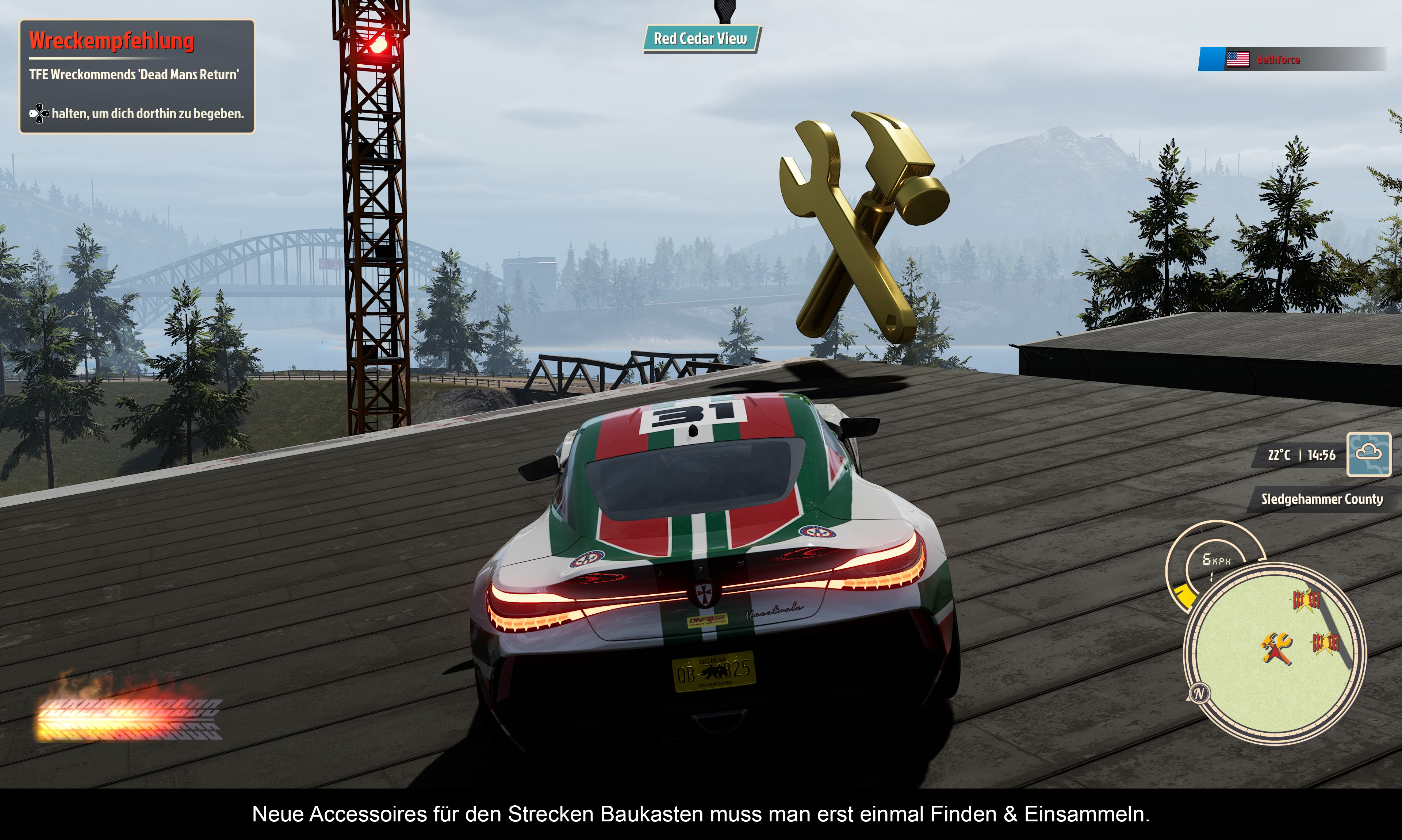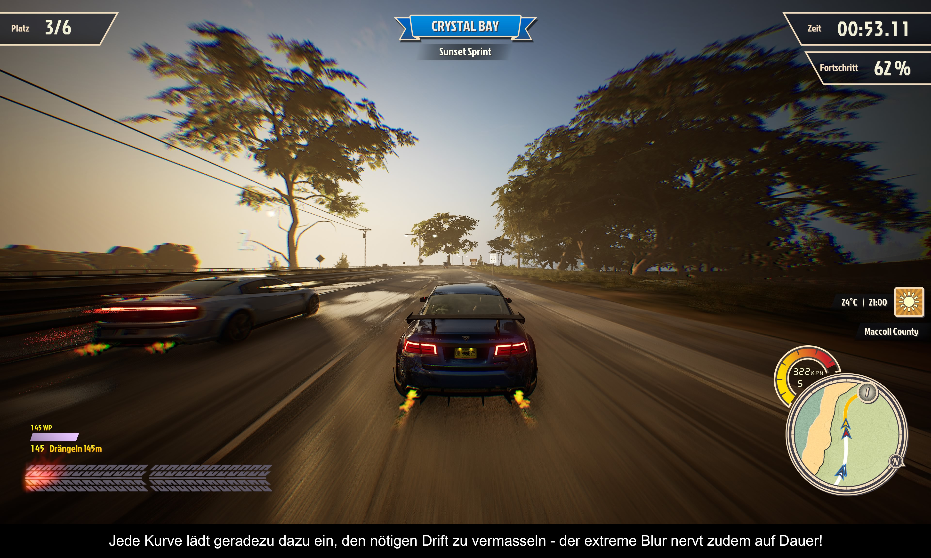 Um gleich mal eines vorwegzunehmen: Grafisch ist das Spiel keine Augenweide. Damit meine ich nicht nur die visuelle Gestaltung, sondern auch die Framerate mit vielen starken Ruckeleinlagen und Tearing. Die versprochenen 60 fps erreicht das Spiel nur, wenn man sich nicht in einem Rennen befindet und sich am besten auch sonst nicht bewegt. Da verwundert es umso mehr, dass die riesige Spielwelt (und ich meine wirklich riesig) so lieblos und austauschbar ausfällt. Es gibt kaum grafische Highlights, die zur Orientierung dienen. Alles wirkt irgendwie hingerotzt. Im Vergleich mit ähnlichen Open-World-Rennspielen wie „Forza Horizon“ oder „The Crew: Motorfest“ liegen Welten dazwischen! Es gibt auch ein paar andere nur schwer nachzuvollziehende Entscheidungen, wie die Schnappsidee, Checkpoints wortwörtlich als Buchstaben auf die Straße zu stellen. Wenn man mit 250 km/h durch brettert, sieht man nicht, was sich dahinter verbirgt, wie z. B. andere Verkehrsteilnehmer. Die unterschiedlichen Wettereffekte sind ganz nett, lenken aber auch vom Geschehen ab und erschweren durch den starken Blur-Effekt die Konzentration auf die Routenführung. Außerdem fahren sich die Autos bei Schnee und Eis noch bescheidener. Die Fantasy-Fahrzeugmodelle können sich dagegen sehen lassen und orientieren sich an realen Vorbildern. Eine Cockpit-Perspektive gibt es nicht (genauso wenig wie einen Fahrer) und auch eine Motorhauben-Ansicht sucht man vergebens. Man kann nur zwischen Stoßstange und Third-Person-Perspektive wählen. Wobei letztere Perspektive automatisch rauszoomt, wenn man Gas gibt. Ein paar zusätzliche Optionen wären nicht verkehrt gewesen. Die Crash-Verformungen sehen nicht besser aus als in „Burnout Paradise“. Richtig amateurhaft fallen dagegen die Pokale aus, die man nach einem Sieg gewinnt. Ähnlich wie bei der Menüführung, die im Grunde identisch mit der von „Burnout Paradise“ ist, wirkt das unfertig und billig. Was die Funktionalität betrifft. Nun ja, manche Dinge waren damals gut, zum Beispiel die Option, Einstellungen zu verändern, ohne das Spiel zu verlassen. Andere Dinge waren damals schon umständlich, weil man eben nicht alles mit einem Tastendruck lösen konnte.