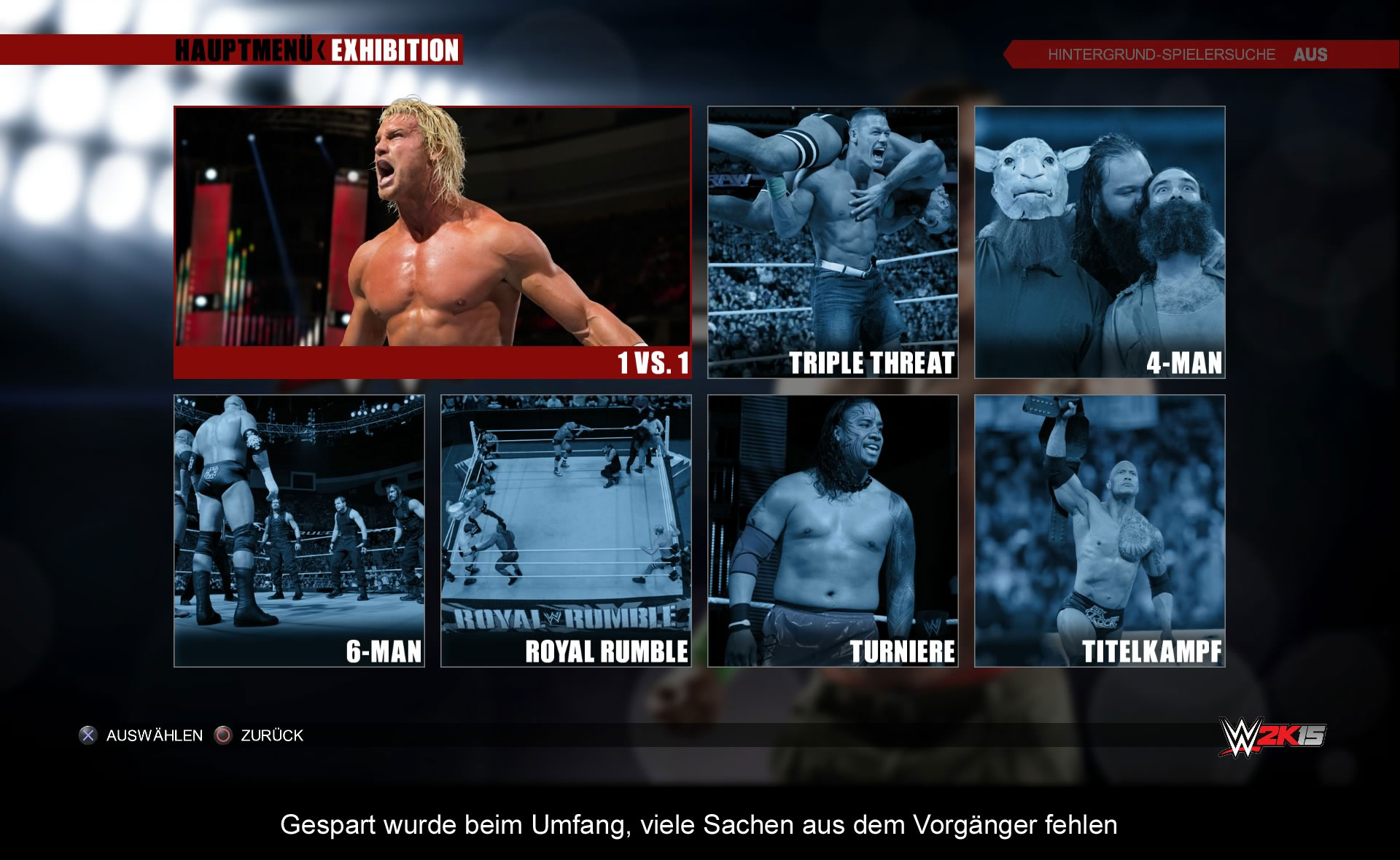 In WWE 2K15 gibt es für Fans diverse Spielmodi. Leider nicht unbedingt mehr als früher. Denn wer sich die möglichen Matcharten im Exhibition-Modus anschaut, wird erschrocken feststellen, dass eine nicht unscheinbare Anzahl im Gegensatz zur Last-Gen Version fehlt. Dazu zählen z.B. 1 vs. 1 Ladder Matches, Triple Threat mit keinen Disqualifikationen, Elimination Chamber Tag mit sechs Mann usw. Es dürften an die 20 Spielmodi fehlen, was schon eine starke Leistung seitens 2K Sports und Yukes Entertainment ist. Aber als wäre das schon nicht schlimm genug, fehlen auch noch diverse Creation Möglichkeiten. Man kann nämlich keine Diven erstellen, keine eigenen Titel, Arenen oder Musik und die Liste geht noch viel weiter und würde den Rahmen des Reviews definitiv sprengen. Übrigens hat es 2k Sports nicht geschafft den Facescan aus NBA 2K15 in WWE 2K15 zu implementieren, was dazu führt, dass man „nur“ ein Bild von sich importieren und im wahrsten Sinne des Wortes auf den Kämpfer klatschen kann. Denn besonders überzeugend sind die Ergebnisse eher nicht und sind schade, da man für den Karrieremodus einen eigenen Kämpfer erstellen kann. Dieser ist einer der nicht gestrichenen Modi und orientiert sich dieses Jahr am MyCareer Modus aus NBA 2K15. Man bekommt also eine komplette Westling-Karriere von der NXT bis zur WWE Championship und muss sich erst hochkämpfen, seinen Kämpfer verbessern und sobald man im TV zu sehen ist in Rivalitäten gegen andere Wrestler durchsetzen. Der ganz normale Wrestling-Alltag eben. Besonders entscheidend ist es den eigenen Kämpfer zu verbessern. Dies geschieht über Talentpunkte, die man fürs Kämpfen erhält. Je nachdem wie gut man die Zuschauer unterhalten hat, erhält man mehr oder weniger davon. Die Punkte können dann anschließend in einzelne Skills des Wrestlers investiert werden. Im Kern klingt das alles recht schön, aber der Modus an sich ist recht Dröge aufgebaut und eigentlich kämpft man einfach nur ohne Ende und hat relativ wenig Einfluss auf die eigene Karriere. Hier ist sicher noch mehr Dramapotenzial vorhanden. Neben dem Karrieremodus verfügt das Spiel auch über die WWE-Welt, in der man sich quasi seine eigene WWE erstellen und nachspielen kann. Hier werden also neue Rivalitäten erstellt, die Kämpfer der einzelnen Rooster eingerichtet und man zieht eben die Strippen im Hintergrund und kann die Kämpfe dann anschließend nachspielen. Wer möchte kann die Kämpfe aber auch simulieren und sich nur die Konsequenzen daraus anschauen.