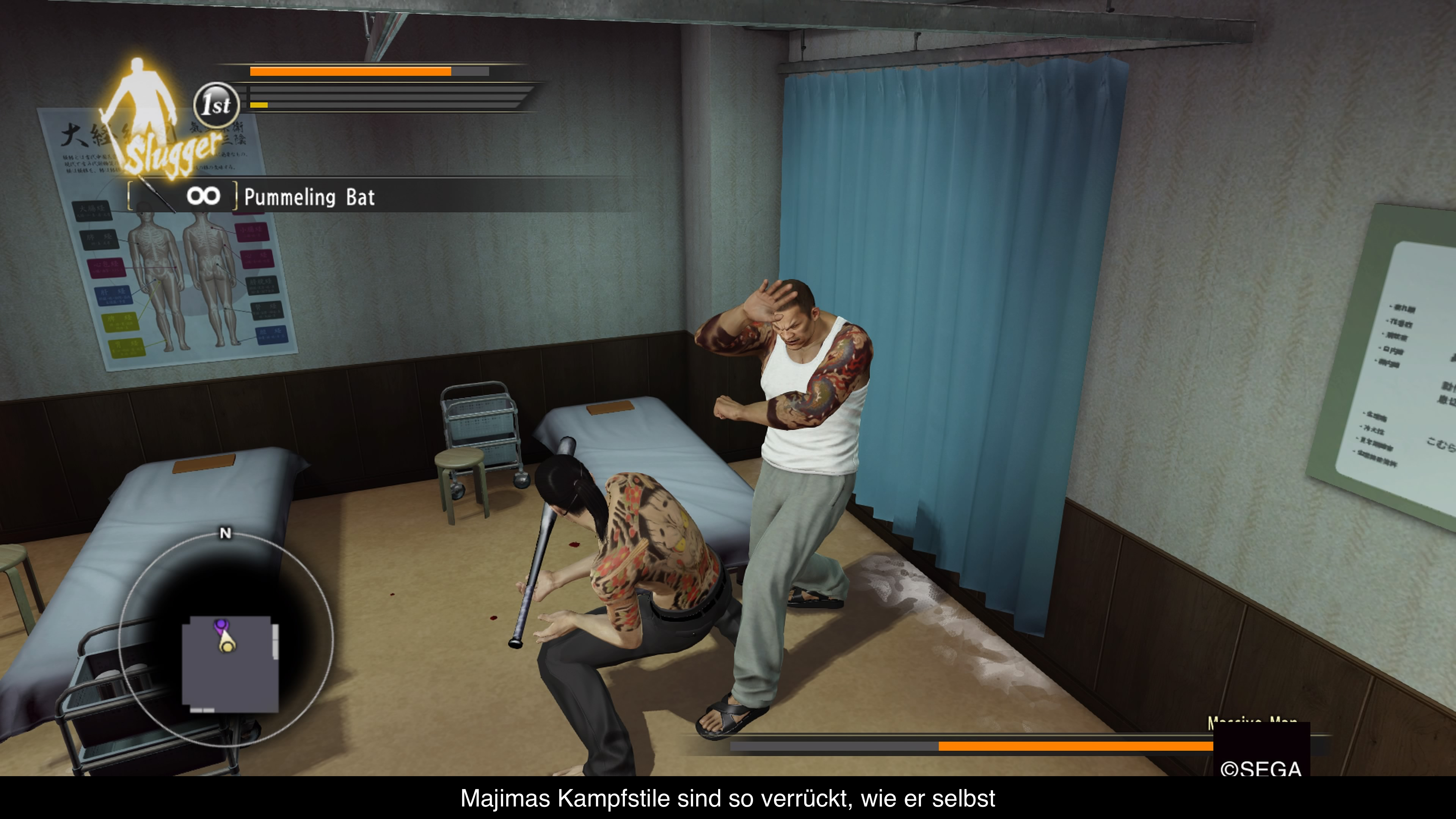 Wenn man sich aber nicht bei irgendwelchen Minispielen die Zeit vertreibt, wird man höchstwahrscheinlich in einem Kampf verwickelt sein. Denn immer wieder begegnen einem auf offener Straße ein paar Yakuza, Betrunkene oder andere Idioten, die meinen sie könnten es mit uns aufnehmen. Hier kommt dann das Kampfsystem des Spiels zu tragen, dass sich seit den PS2-Teilen nicht bahnbrechend verändert hat. Man teilt also leichte und schwere Schläge aus, kann Blocken und Ausweichen und muss sich meist gegen mehrere Gegner behaupten. Wer möchte kann hierbei noch zwischen mehreren Stilen wechseln, die unterschiedliche Fähigkeiten besitzen. Mal ist man besonders schnell, mal legt man die Gegner mit Breakdance-Moves auf Kreuz und dann kann man auch Gegenstände aus der Umgebung mit einbeziehen. Denn was gibt es schöneres als den Gegner mit dem Sofa eins über die Rübe zu ziehen? Das funktioniert besonders gut, wenn die Heat-Anzeige durch viele erfolgreiche Schläge aufgeladen wurde und man Spezialangriffe ausführen kann, die den Gegner besonders viel Lebensenergie kosten. Es dauert zwar etwas bis man alle Fähigkeiten und Stile freigeschaltet hat, aber dann entfaltetet das Kampfsystem wirklich seine Flügel und macht Spaß. Bis dahin wirkt es zum Teil ziemlich altbacken und frustrierend, weil alles nicht ganz so flüssig von Statten geht, wie man es aus anderen Spielen gewohnt ist. Nach einiger Zeit ändert es sich aber grundlegend und macht deutlich mehr Spaß und man prügelt sich nur so durch die Gegnermaßen.