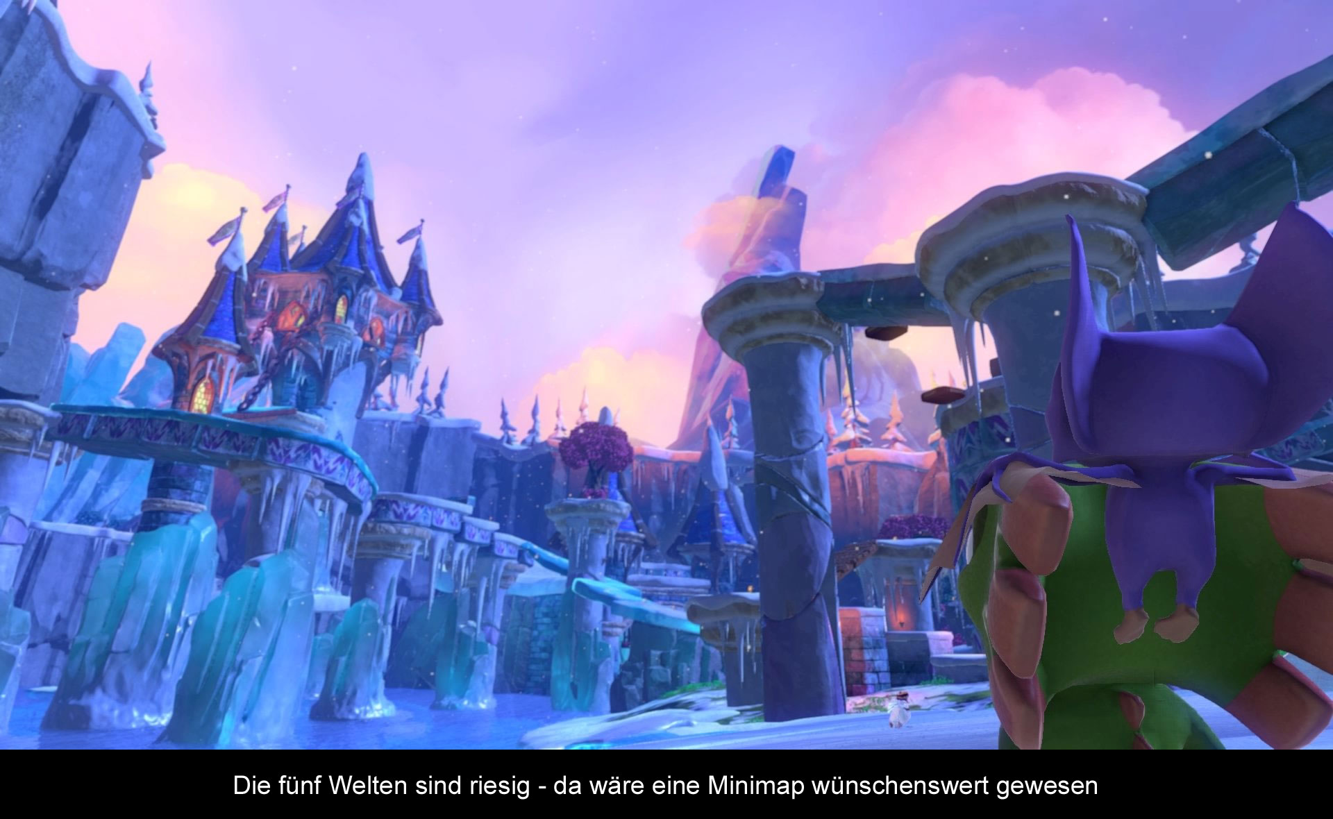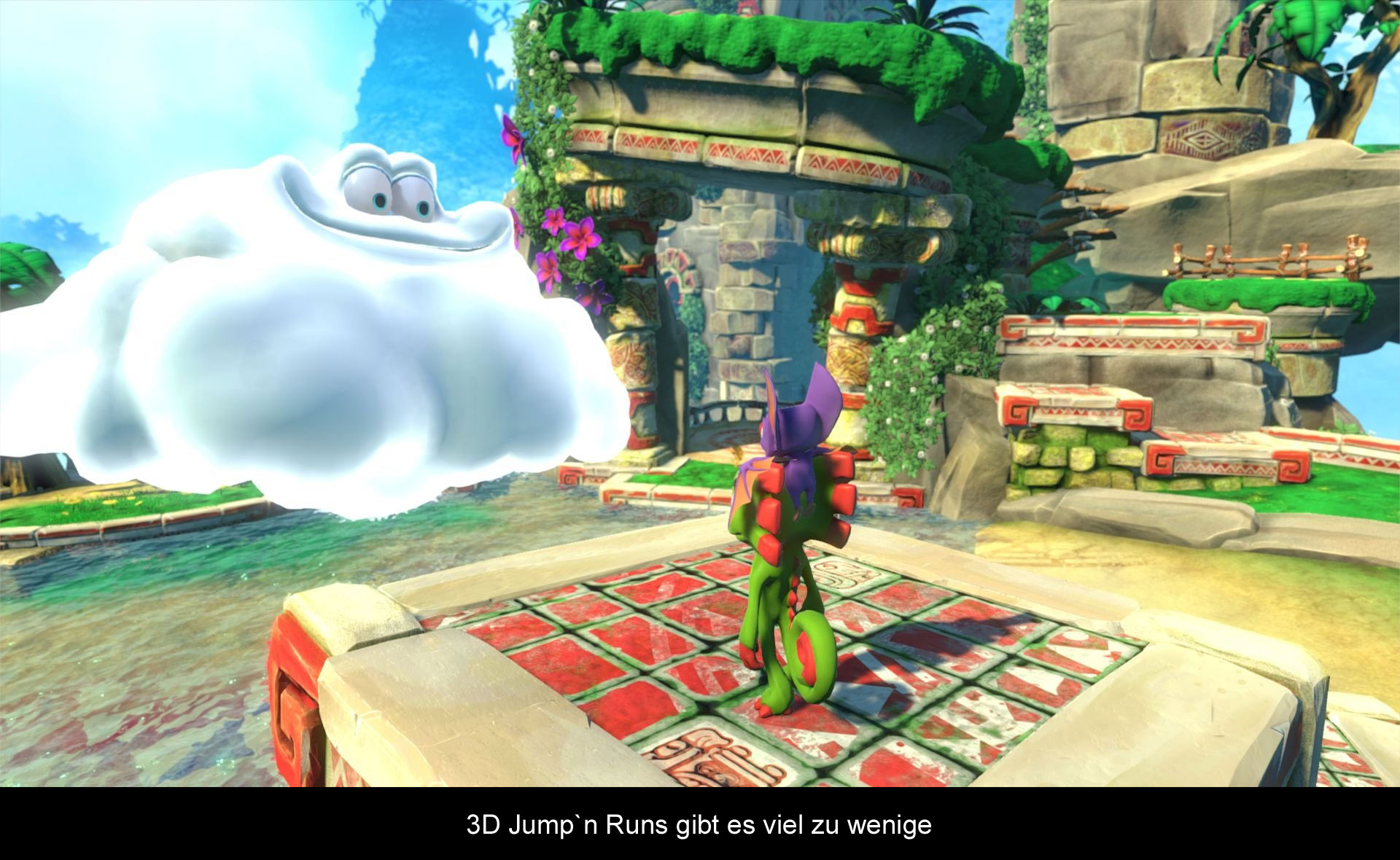 Ein Bereich, wo das Spiel jedoch zu wünschen übriglässt, ist die Kommunikation mit dem Spieler. Da es so gut wie keine Hilfe seitens des Spiels gibt, kann es mitunter sein, dass man viele Gegenstände oder Passagen in der Welt übersieht, oder erst herausfinden kann, indem man mit ihnen interagiert. Etwas mehr kontextbezogene oder visuelle Hilfe wäre an dieser Stelle schön gewesen. Das gleiche Problem tritt auch bei einigen Rätseln auf, die dermaßen abstrakt sind, dass einzig der Griff nach Google weiterhilft. Ebenso nervig ist es, wenn die Kamera an ihre Grenzen stößt, was vor allem bei Herausforderungen mit hohem Bewegungsgehalt schnell zu frustrierenden Momenten führen kann. Darüber hinaus fand ich auch, dass die Steuerung Präzision vermissen lässt. Die Steuerung von Yooka und Laylee wirkt zwar nicht ganz so schwammig, wie zum Beispiel die von Little Big Planet, aber die Höhen von Super Mario oder Rayman erreicht es wiederum auch nicht, was angesichts zahlreicher Plattform-Passagen wünschenswert gewesen wäre. Und auch das Speichersystem ist meiner Meinung nach alles andere als ausgereift, da es zum einem keine Möglichkeit gibt, um manuell zu speichern und zum anderen, Checkpoints viel zu selten vorkommen. Ach ja, und Bossgegner gibt es auch noch: Doch wer möchte, kann diese sogar komplett ignorieren. Und zugegebenermaßen wäre dies auch kein großer Verlust, da die Endbosse allesamt auf simple Gameplay-Mechaniken beruhen und trotz interessanter Designs keine große Alternative zu den dümmlichen Standardgegnern darstellen. Obwohl Yooka-Laylee dennoch vieles richtigmacht und tatsächlich genau das bietet, was es einst versprochen hat, kommt es mir jedoch so vor, als hätte das Team vergessen, einige sinnvolle Elemente heutiger Spiele miteinzubeziehen; sei es eine Mini-Map oder eine bessere Visualisierung der eingesammelten Objekte. In Gamer-Kreisen tragen solche Features den Namen „Quality of Life“. Diese sogenannte „Lebensqualität“ bleibt bei Yooka-Laylee jedoch größtenteils auf der Strecke.