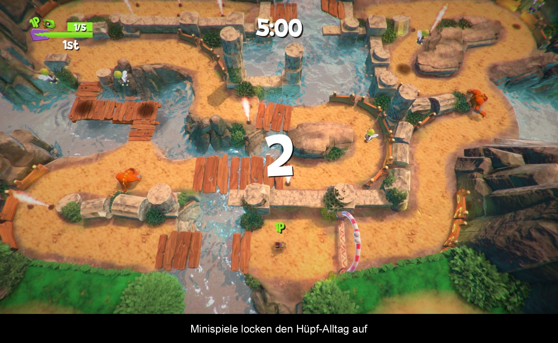Im Mittelpunkt des Gameplays steht die Wiederbeschaffung der verloren gegangenen Seiten, die auf insgesamt fünf Level verteilt sind. Das dass kein leichtes Unterfangen wird, erkennt man bereits an der ersten Welt. So erstrecken sich die Gebiete über weite Ebenen, hohe Türme und tiefe Gewässer. Um weitere Welten freizuschalten, benötigt man die zuvor erwähnten Buchseiten, welche man dann in der Hub-Welt gegen den Eintritt in neue Areale eintauschen kann. Und ganz im Stile von Banjo-Kazooie erlangt man die Seiten durch das erfolgreiche Erledigen von verschiedenen Aufgaben, wie zum Beispiel die Bewältigung von Plattform-Passagen, Rätseln, Rennen oder sogar Golf-Spielen. Und auch an den vielen Herausforderungen lassen sich die Wurzeln des Spiels ganz klar erkennen. So lehnen sich beispielsweise die Fahrten mit dem Grubenwagen an die Abenteuer von Donkey Kong an. Und auch die vielen bunten und liebenswerten Charaktere, auf die man in den einzelnen Leveln trifft, wecken erneut den Charme der 64-Bit Ära. Und Yooka-Laylee wäre keine klassischer „Rare-Plattformer“, wenn es nur darum gehen würde, eine einzelne Sache zu sammeln. Genauso wichtig wie die Buchseiten sind nämlich auch die Federn, von denen es insgesamt über 1000 Stück in den fünf Welten gibt.