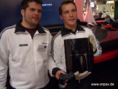 Nach dem Abstecher in die Antike, führte uns unsere Tour zu Gangs of London, dem neuen The Getaway Ableger für die PSP. Auf den ersten Blick machte das Spiel technisch eine gute Figur, die Framerate war konstant und flüssig, die Ladezeiten kurz und London sah ziemlich gut aus. Was allerdings sofort auffiel, die Autos waren nicht mehr lizenziert. Macht aber nix, denn sowohl das Gunplay zu Fuß, als auch die Verfolgungsjagden waren relativ spaßig. Nur im Touristenmodus, wo man Londons Sehenswürdigkeiten fotografieren muss, stieg ich nicht ganz durch. Bevor ich jedoch ein finales Urteil fälle, möchte ich noch ein wenig mit der bereits bestellten Preview Version zocken. Auf dem Sony Stand gab es zwar noch Rouge Galaxy (das neue Action RPG von Level 5) und Ace Combat: The Belkan War zu sehen, aber angesichts wenig Zeit, konnten wir die Spiele wenn überhaupt nur kurz anspielen. Weiter ging es dann nämlich sofort zum PS3 Theatre, welches ein paar schöne Sitzbänke bot und auf riesigen HD Bildschirmen diverse E3 Trailer zeigte. Leider bekam man jedoch nichts Neues zu sehen, weswegen wir nicht allzu viel Zeit an diesem Ort „verschwendeten“. Viel interessanter war dagegen die ausgestellte echte PlayStation 3, die von zwei Sony Mitarbeitern der Presse präsentiert wurde. Neben der PS3, wurde auch der Controller gezeigt und wir ließen uns nicht lange bitten und nahmen ihn selbst in die Hand.