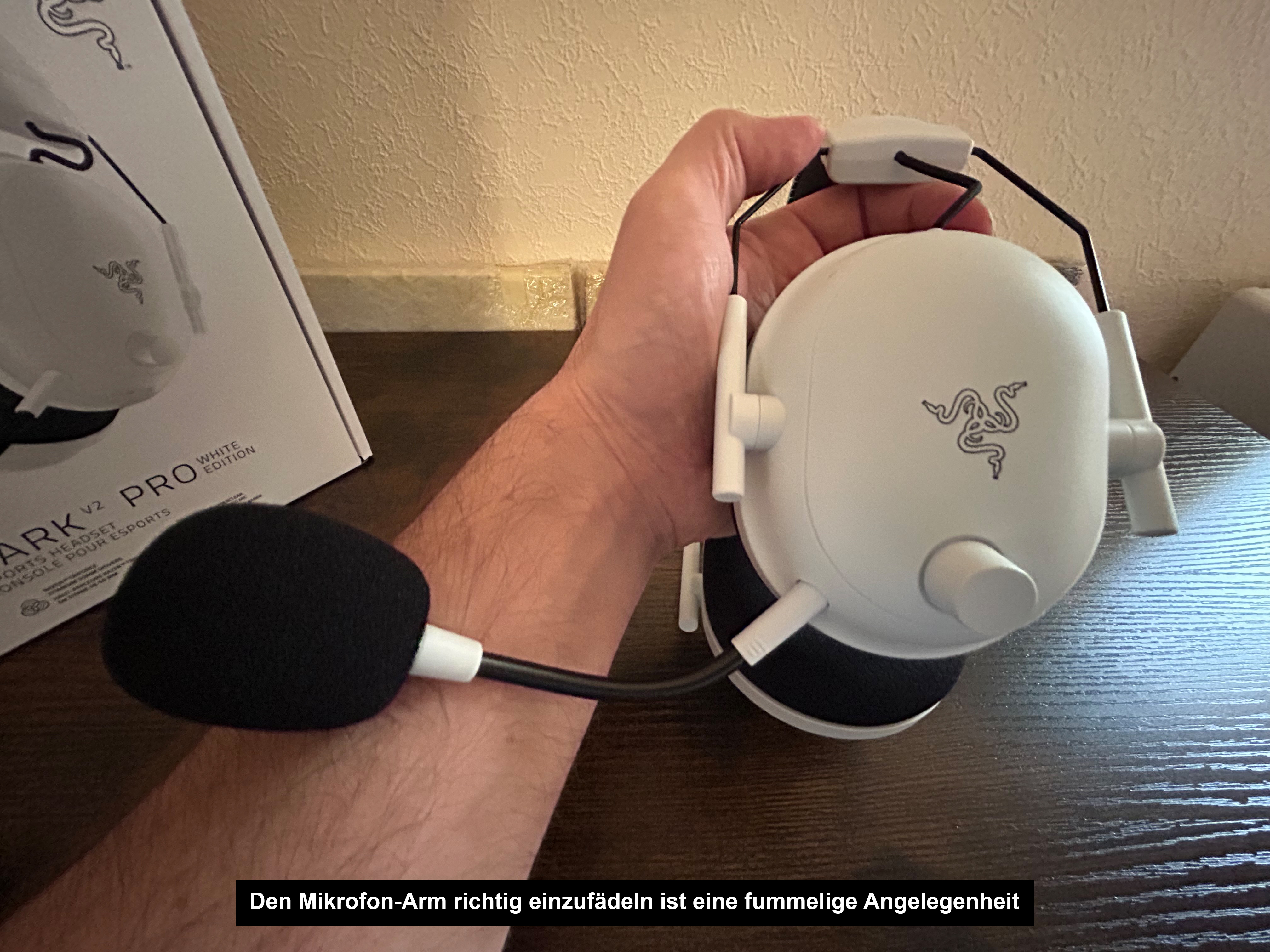 Eines vorweg: Das Blackshark ist wie viele andere Razer Produkte kein „billiges Teil“ und dass meine ich nicht nur hinsichtlich des Preises. Die Auswahl an hochwertigen Materialien und die Verarbeitung können bereits auf den ersten Blick überzeugen. Das Headset wiegt wenig (320g) und trägt sich wirklich angenehm leicht. Dazu kommen die extra-weichen und atmungsaktiven Memory-Schaum Kissen auf den Ohrmuscheln und der besonders dick gepolsterte Bügel. Vorbei sind auch die Zeiten von wuchtigen Befestigungen zwischen Kopfbügel und Ohrmuschel – die dünnen Stäbe sind aus Stahl und sollen für eine lange Haltbarkeit sorgen. Der biegsame Mikrofonarm passt gut in den Anschluss, wenn man beachtet, dass man ihn nur auf bestimmte Weise einstöpseln kann – denn die minimale Lasche habe ich zumindest beim ersten Mal übersehen und mich dann gewundert, warum das Teil nicht bündig abschließt.