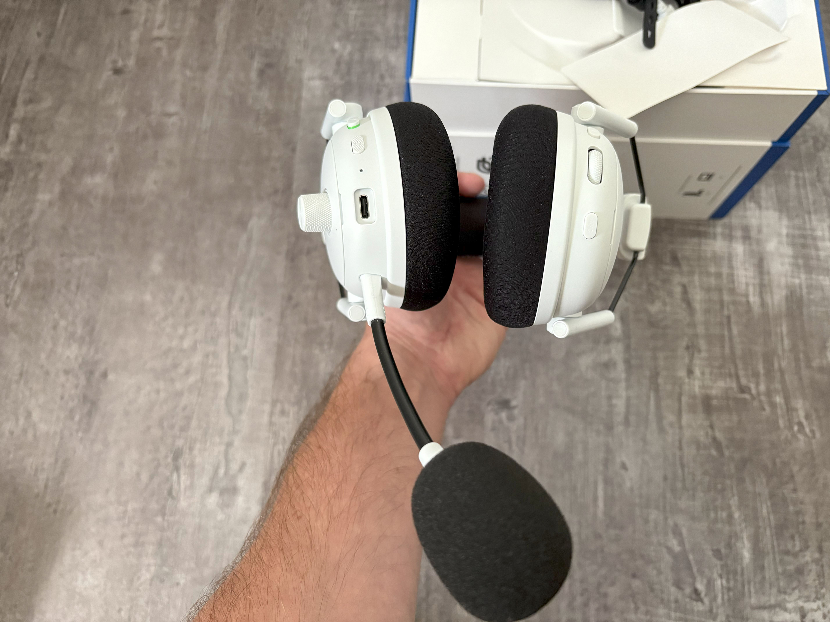 Das Headset macht einen wertigen Eindruck. Nichts fühlt sich billig an und es sitzt auch gut. Im Gegensatz zum Vorgängermodell lässt sich der Mikrofonarm jetzt auch blind einstöpseln, da der Anschluss spezifisch geformt ist. Durch einen Aufdruck an den Ohrmuscheln sieht man jetzt auch, was rechts und was links ist. Mit 367 g ist das Blackshark V3 Pro kein Leichtgewicht, aber das Gewicht bewegt sich noch im Rahmen. Das Headset sitzt ordentlich auf den Ohren und der Bügel drückt nicht, obwohl er dünner gepolstert ist. Der Ein-/Aus-Schalter ist übrigens ebenfalls blind ertastbar, da er eine geriffelte Oberfläche aufweist. Ansonsten gibt es auf der Seite noch einen Knopf, um das Mikrofon stummzuschalten, einen Drehregler für die Lautstärke und einen winzigen LED-Indikator mit drei Farben: Grün bedeutet Wireless-Verbindung, Blau Bluetooth und Weiß, dass beide verbunden sind. Zudem gibt es einen USB-C-Anschluss zum Laden des Akkus. Auf der anderen Seite befindet sich der SmartSwitch-Knopf. Durch einmaliges Drücken schaltet man durch die gespeicherten EQ-Profile (bis zu 9 Stück) und durch einen Doppelklick wechselt man die Verbindungsmodi (Wireless, Bluetooth, simultanes Audio). Dann gibt es ein Drehrad, das auch programmierbar ist. Standardmäßig ist die Mic-Sidetone-Funktion hinterlegt, aber über die Synapse-App kann man auch andere Funktionen hinterlegen/steuern, z. B. die Fußstapfen-Skalierung. Zu guter Letzt gibt es noch einen Knopf für das ANC.