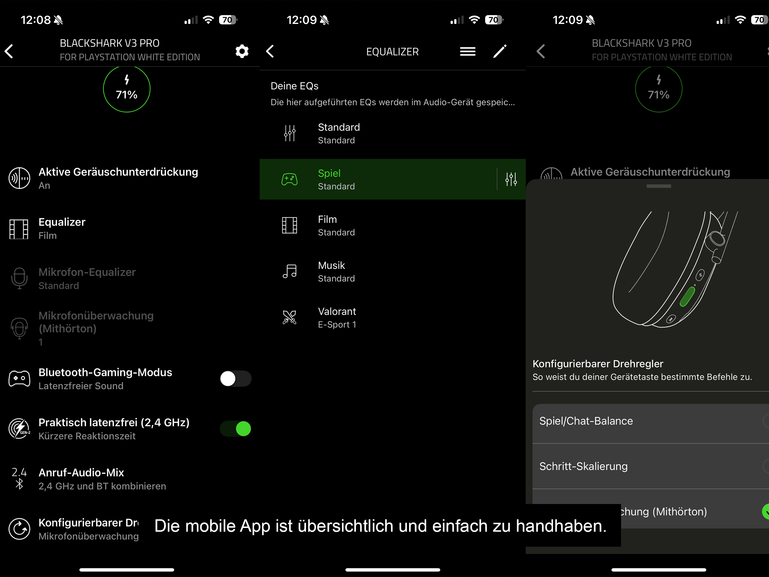 Die Impedanz liegt bei 32 Ohm und ist damit für den mobilen Einsatz vollkommen ausreichend. Denn je höher dieser Wert ist, desto mehr Spannung wird benötigt und desto schneller ist der Akku leer. Dazu gibt es übrigens keine Angaben seitens des Herstellers, aber mit ANC dürften es zumindest keine 48 Stunden mehr sein. Man kann neun Equalizer-Profile auf dem Headset speichern, in der Synapse-App sind zwölf vorgefertigte Profile für diverse Spiele wie Apex Legends oder Fortnite hinterlegt.