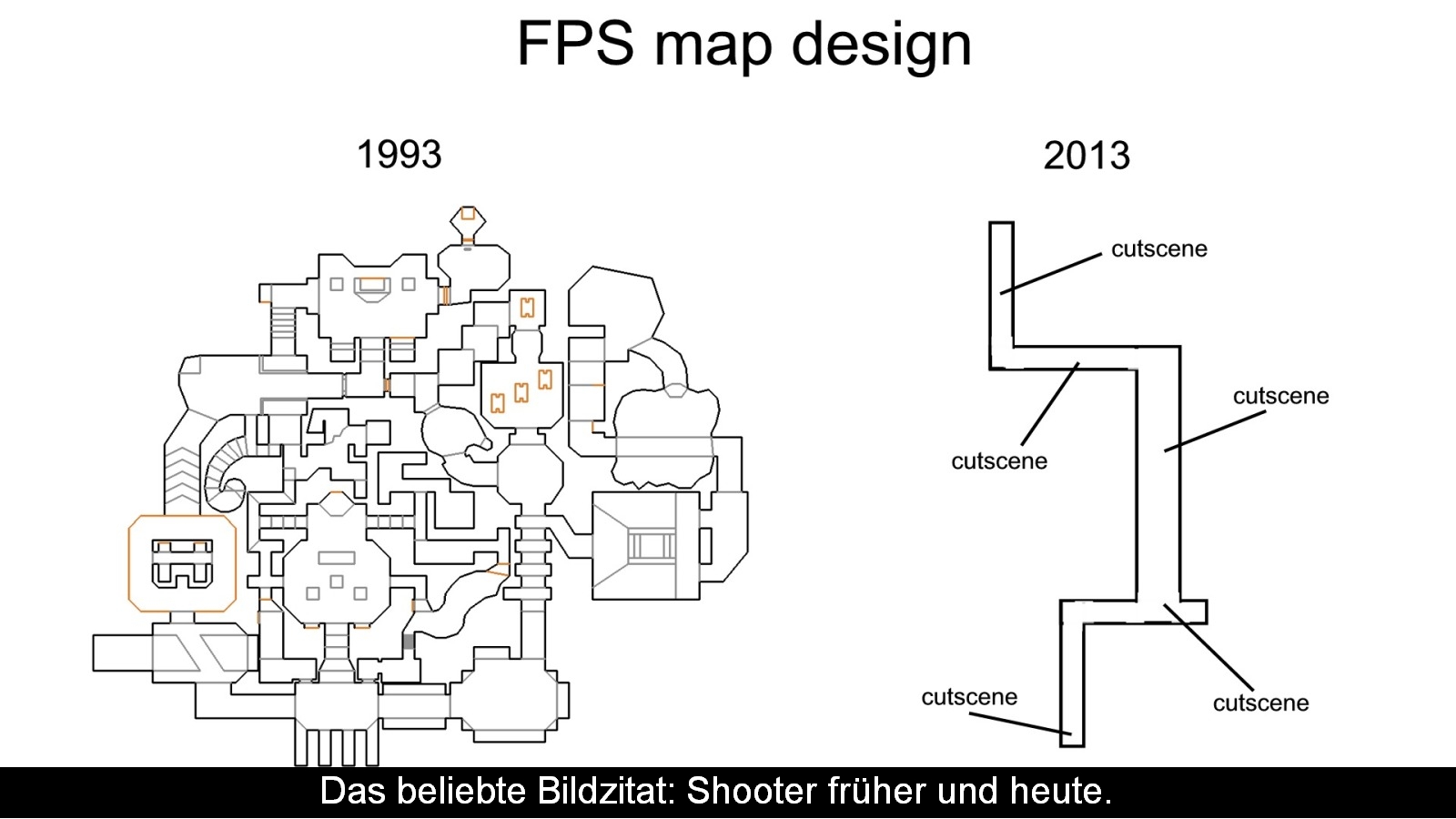 Das Bild ist natürlich nicht wirklich fair, schließlich wurde man früher auch durch viele Korridore gejagt und selbst die vermeintlich größeren Abschnitte waren mit manchen Aussichten selbst superlinearer Spiele wie der Call of Duty Reihe nicht zu vergleichen. ABER dieses Bild betrifft einen Aspekt der in den letzten Jahren immer deutlicher wurde: während man sich früher den Weg vom Levelbeginn zum Levelende bahnte und dabei die Karte schön langsam kennen lernte, wird man bis zu Beginn der aktuellen Konsolengeneration noch oft direkt von A nach B gewiesen. Mal bog man links, mal rechts ab. Mal ging es rauf durch ein Gebäude, mal runter durch einen Keller – aber immer sehr geradlinig.