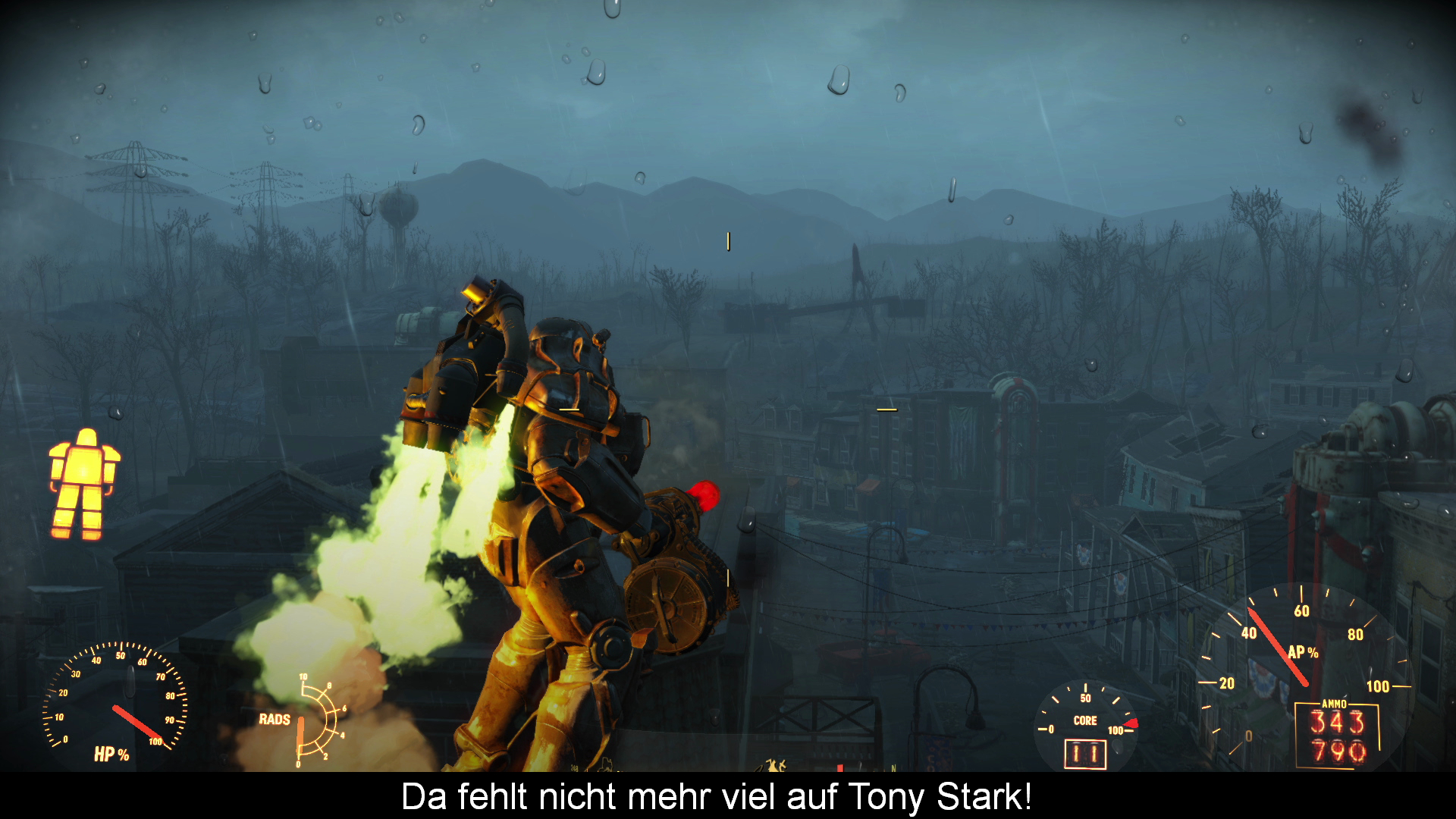 Da stoße ich auf eine Siedlung, die wie aus den USA der 1930ern wirkt, finde einen völlig intakten Vault wie ich ihn aus Teil 3 kenne, durchforste ein schier endloses Hochhaus, als quasi moderne Version eines Dungeons oder erlebe wie sich ein rießiger Berserker mit einem RAD-Skorpion keilt, um dann die Reste aufzusammeln. Als Zuckerguss oben drauf bringen hier Sammelgegenstände wirklich etwas. Ich sammle nicht ewig Flaggen um einen hässlichen Extra-Anzug freizuschalten, der mir rein gar nichts bringt. Ich sammle jedes Stückchen Schrott um meine Laserwumme aufzurüsten, meine simple Power Armour in einen Iron Man Anzug zu verwandeln (mit Stealth oder Jetpack-Ausrüstung) oder ein Haus zu bauen um meine Ausrüstung sinnvoll und einfach abzulegen (geschenkt wird auch das nicht im Spiel).