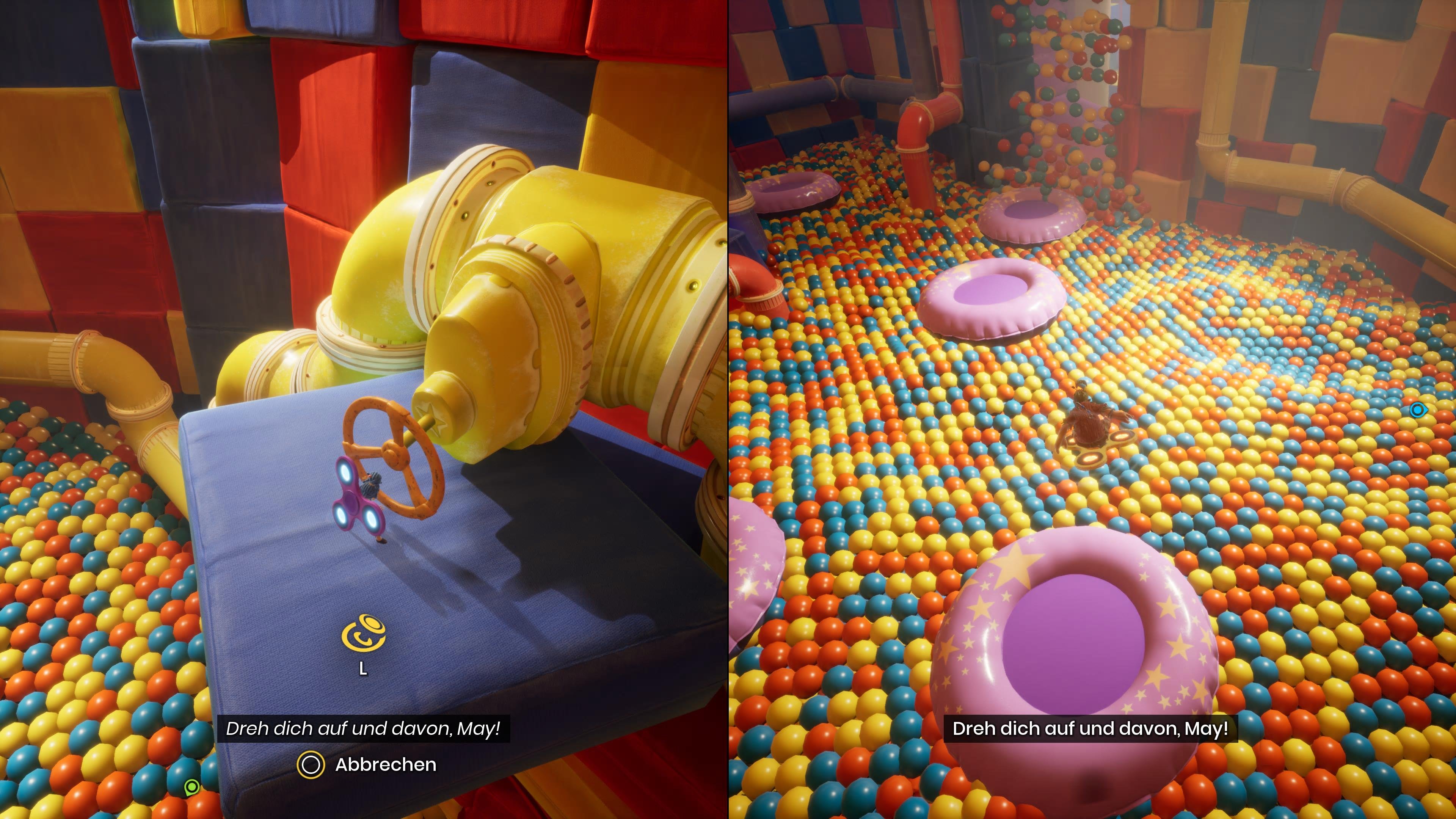 Wie eingangs erwähnt, benötigt man zum Spielen von It Takes Two zwei Spieler. Diese können lokal an einer Konsole oder auch online zusammen spielen. Dabei kann man sogar einen Freund online einladen, der das Spiel gar nicht besitzt! Nun wählt man eine Spielfigur aus und dann geht das Abenteuer los. It Takes Two ist in mehrere Kapitel unterteilt, die euch unterschiedliche Herausforderungen stellen und immer einen anderen Fokus auf Zusammenarbeit legen. Beispielsweise kann Cody in einem Level Glibber verschießen, der von May dann entzündet werden kann. Mit dieser simplen Mechanik muss man dann zahlreiche unterschiedliche Puzzle lösen und bevor es langweilig wird, ist schon die nächste Mechanik an der Reihe. Dabei ist das Spiel selten frustrierend und beispielsweise kann man unendlich oft sterben und direkt weitermachen. Das macht das Spiel besonders für Videospiel-Neulinge interessant.