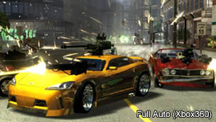Das Herzstück des Spiels ist aber sowieso der "Career" Modus. Hier findet man über dreißig verschiedene Missionen, die außerdem in eine recht flache Story verpackt wurden. Die Auswahl reicht dabei von simplen Rennen um die ersten drei Plätze, bis hin zu Eskortierungs- und Beschützermissionen. Neben den primären Zielen, die man erfüllen muss, um weitere Aufgaben frei zuschalten, gibt es auch noch zusätzliche - sekundäre - Ziele. Diese braucht man zwar nicht zwangsläufig zu absolvieren, um das Spiel zu beenden, aber dadurch werden spezielle "Reward Packs" frei geschaltet. Diese können Waffenupgrades oder sogar neue Fahrzeuge beinhalten. Je mehr sekundäre Ziele man also erfüllt, desto mehr schaltet man auch im Spiel frei. Bis man wirklich alles im Einzelspielermodus erspielt hat, vergeht allerdings einige Zeit. Wie dem auch sei, "Full Auto:2 Battlelines" ist, wie ihr mit Sicherheit schon bemerkt haben dürftet, kein normales Rennspiel, sondern vielmehr eine Crashorgie im Stil von "Twisted Metal". Zwar fährt man auch "normale" Rennen, allerdings kann man sich dabei diverser Hilfsmittel bedienen. Diese kleinen Helferlein befestigt man direkt an seinem Fahrzeug. Dabei hat man stets die Wahl zwischen "einfacheren" Waffen wie einem MG, oder durchschlagskräftigeren Argumenten wie Granat- oder Raketenwerfern. Sehr amüsant ist es auch, die komplette Strecke mit Minen zu bepflastern, was durchaus auch zu einem Sieg verhelfen kann. Allerdings sind die Gegner ebenfalls äußerst unbarmherzig, was man ziemlich schnell am eigenen Leib erfährt...