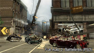 Zu Beginn des Spiels stehen insgesamt vier Spielmodi zur Verfügung. Zunächst wäre da der "Arcade" Modus: Auf den ersten Blick wirkt diese Spielvariante lediglich wie eine nette Dreingabe, entwickelt sich aber nach ein paar Runden zu einer sehr spaßigen Angelegenheit. Man tritt dabei in verschiedenen Arenen gegen den Computer an und kann seiner Zerstörungswut freien Lauf lassen. Passend dazu gibt es auch noch einen normalen "Race" Modus, sowie "Gladiator" und "Team Gladiator" Spiele. Leider wurde der "Arcade" Modus jedoch nur für Einzelspieler ausgelegt, weswegen Multiplayer Freunde hier außen vor bleiben. Dafür dürfen die sich dann im "Head to Head" Modus austoben. Wobei es dort ein paar Einschränkungen gibt, da man nur gegen einen anderen menschlichen Mitspieler via Splitscreen antreten kann. Für gesellige Abende vor einer Konsole ist "Full Auto 2" somit weniger geeignet. Will man stattdessen gegen mehr als einen menschlichen Gegner spielen, sollte man den umfangreichen Online-Modus wählen. Hier darf man sich schließlich mit Spielern aus aller Welt messen und sie zu actionreichen Crashduellen herausfordern. Insgesamt können sich bis zu acht Teilnehmer in den Schlachten bekämpfen. Hört sich eigentlich recht gut an, wenn es nicht einen großen Haken gäbe. Im Gegensatz zu populären Spielen wie "Resistance" sind die Server (zumindest in Nordamerika) bei "Full Auto 2: Battlelines" recht leer. Ist tatsächlich mal ein Spiel eröffnet, so finden sich gerade einmal zwei oder drei Leute zu einer Runde zusammen, was natürlich nicht sonderlich spaßig ist.