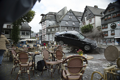 Zwar geben sich hier die Hollywood Stars die Klinke in die Hand, doch dank des Settings fühlt man sich unweigerlich an eine Folge “Cobra 11” erinnert. Es gab schon viele Filme, die deutsche Städte als Drehorte nutzten, doch so ausgiebig und nah dran war bis jetzt noch keine ausländische Produktion. Köln IST Köln (oftmals doubeln deutsche Städte nur andere Locations) und Kölner, bzw Monschauer werden sich hier mehr als heimisch fühlen, wenngleich der Realismus etwas auf der Strecke bleibt. Oder glaub echt einer daran, dass der 1. FC Köln mal Deutscher Meister wird. Auch sonst kommt es immer wieder zu lustigen und skurrilen Momenten. Wenn zum Beispiel ein Joachim Król eine Flinte aus seinen Pick Up holt als wäre es das normalste der Welt in Deutschland und sich dann in einer Tanke mit Sir Anthony Hopkins ein Psychoduell liefert, während man im Hintergrund die Super Illu liegen sieht, ist das schon mehr als skurril. Die Actionszenen wurden dabei von action concept inszeniert und man muss es den Jungs echt lassen. Wenn sie ein ordentlichen Budget zur Verfügung haben, dann kracht es ordentlich und sie können es ohne Probleme mit amerikanischen B-Movie Produktionen aufnehmen. Die Verfolgungsjagden sind dabei abwechslungsreich und mischen gekonnt Autostunts mit zu Fuss Erkundungen und rücksichtslosen Shoot Outs. Besonders die Szenen in Monschau wissen dabei zu überzeugen. Leider sind die Actionszenen aber nicht sonderlich zahlreich, da “Collide” auch versucht, eine Geschichte zu erzählen.
