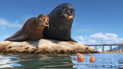 So machen sich die drei also auf die Suche nach Dories Eltern und treffen recht schnell und gefahrlos an dem Ort ein, wo sich ihre Eltern aufhalten sollten. Im Meeresbiologischen Institut geht das Abenteuer dann richtig los, da sich Dorie mit ihrem Gedächtnisproblem allein zurechtfinden muss. Immerhin lernt sie schnell den Okto … ähm, Septopus Hank kennen, der anfangs zwar etwas eigennützig handelt, aber letztendlich Dorie schnell ans Herz wächst. Hank ist dabei auch der gelungenste neue Charakter, da er trotz seiner stets mies gelaunten Art ein weiches Herz hat. Zudem erweist sich seine Tarnfähigkeit als extrem nützlich und sorgt für viele lustige und teils slapstickartige Situationen. Neben Hank, gibt es aber noch Unterstützung vom Beluga Wal Baileys der unter Hypochondrie leidet und den Walhai Destiny, welche wiederum mit einer Kurzsichtigkeit zu kämpfen hat. Das lustigste Tierchen ist aber Becky, eine völlig gestörte Eistaucher Dame, welche Marlin mehr als nur einmal zur Weißglut bringt. Leider gibt es Disney typisch aber wieder ein paar Figuren, welche eine absolut nervige bayerische Synchronstimme bekommen haben. Warum? Zumal bei den Seelöwen ein Norddeutscher Akzent besser gepasst hätte.