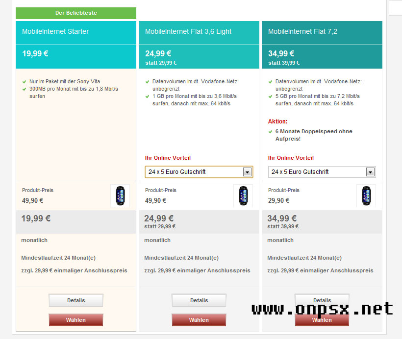 Bekanntlich ist Vodafone der 3G Partner von Sony PlayStation in Europa. Mittlerweile bewirbt der Telefondienstleister den Handheld sogar auf seiner Website. Billig wird das INternetvergnügen jedoch nicht. Die Verträge laufen alle 24 Monate und kosten mind. 19,99€ im Monat, allerdings hat man hier nur 300MB Datenvolumen und eine Geschwindigkeitsdrosselung auf 1,8Mbit/s. Wer dagegen stolze 34,99€ im Monat investiert, bekommt die Vita-Hardware für 29,99€ überlassen und 5GB mit Downloadgeschwindigkeiten von bis zu 7,2Mbit/s garantiert, danach geht es immerhin noch mit 64kb/s weiter.