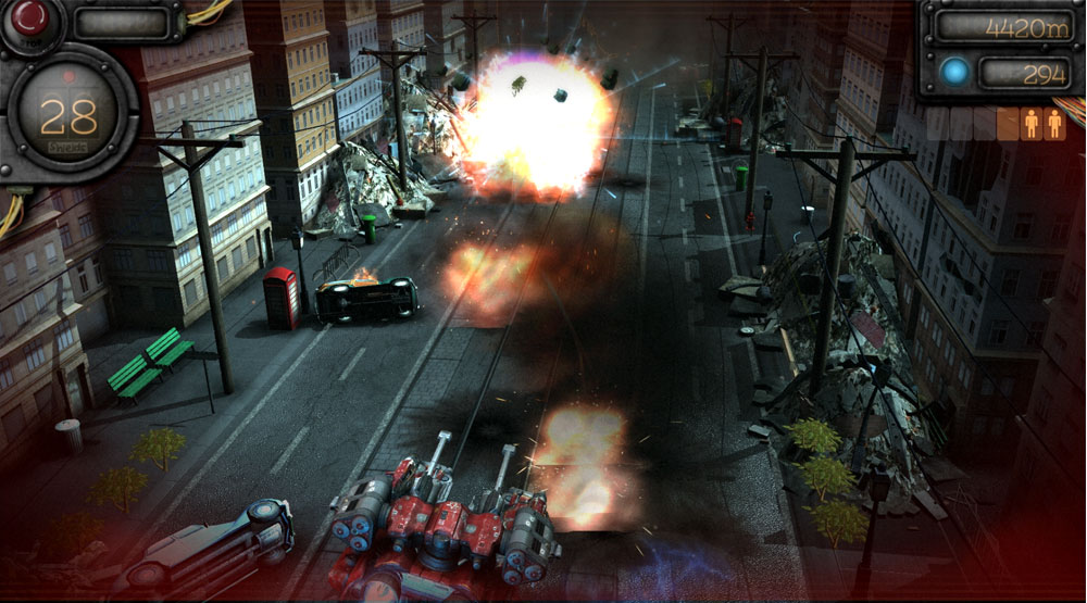 Im Prinzip handelt es sich um das bekannte Spielkonzept, bei dem mit einem Mech / Panzer Transformer auf festgelegten Bahnen, soweit wie möglich kommen muss. Neben Bosskämpfen und dem Retten von Zivilisten, kann man auch noch seinen "Runner" mit besseren Waffensystemen aufrüsten. Höhpunkt ist wohl das Design von Industriedesigner Josh Nizzi, bekannt für Designs in den Filmen Avengers und Bayformers.