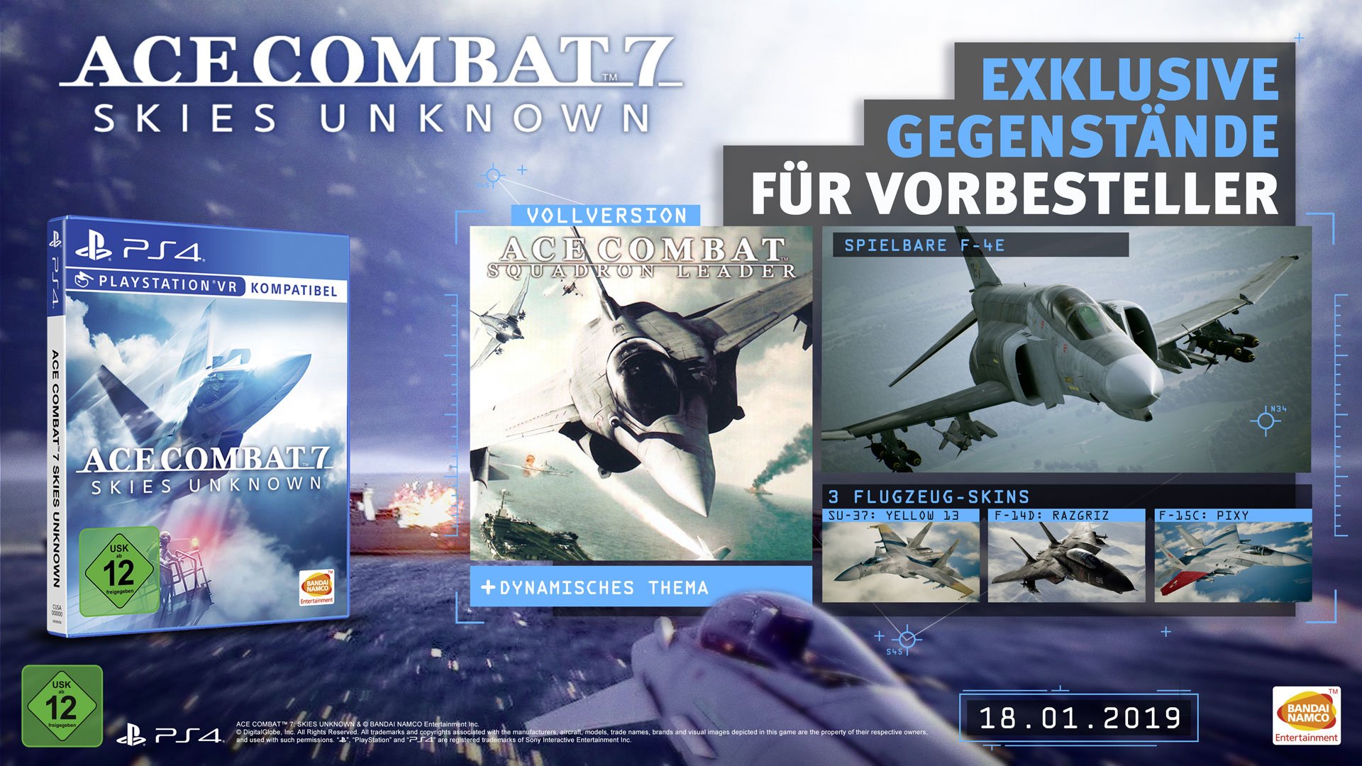Jeder Spieler, der Ace Combat 7: Skies Unknown vorbestellt, erhält die Boeing F4-E Phantom II zusammen mit drei weiteren Flugzeug-Skins. Zusätzlich erhalten PS4 Vorbesteller Ace Combat 5: Squadron Leader (digital).