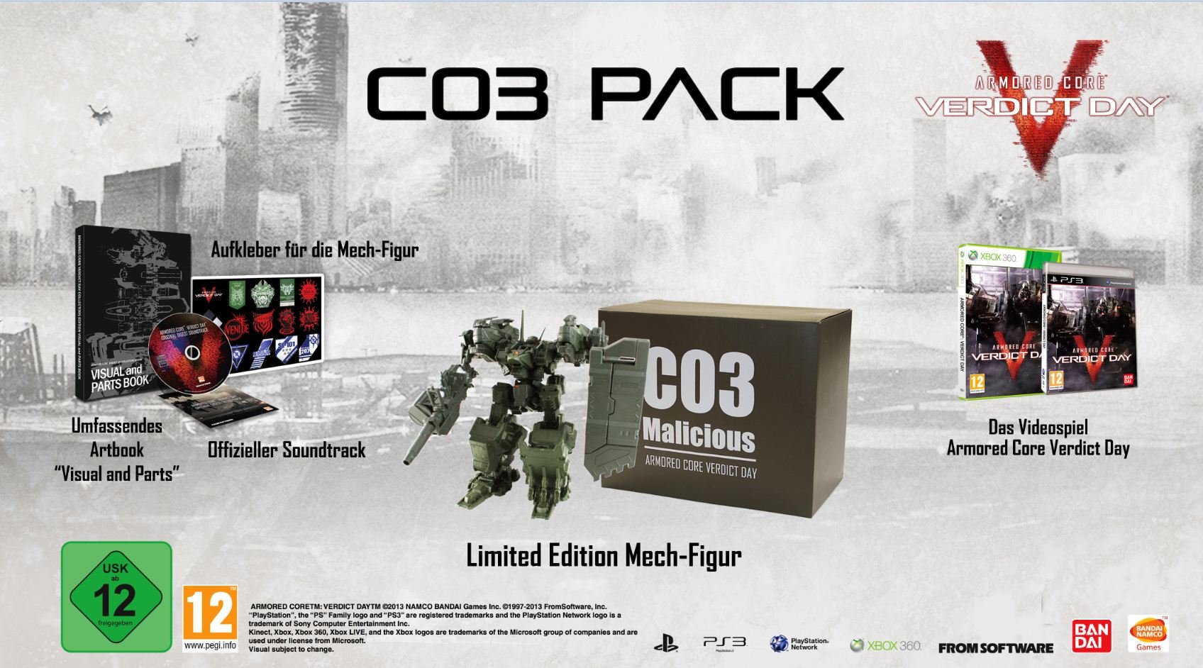 Das C03 Pack enthält neben dem Spiel den Soundtrack, eine Zusammenstellung von Artworks mit mehr als 270 Seiten und eine hochdetailiert modellierte Mech-Action-Figur, inspiriert von Armored Core: Verdict Day!