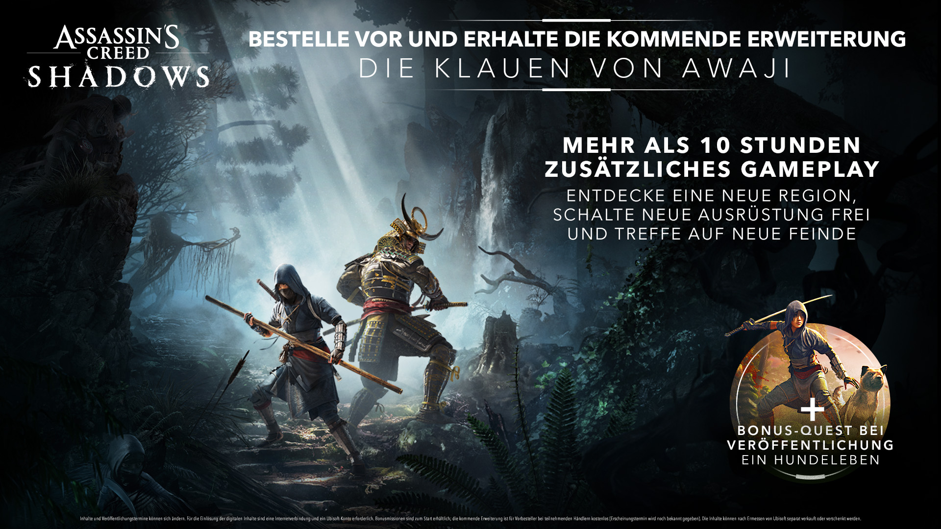 Zusätzlich erhalten alle, die das Spiel vorbestellen, kostenlosen Zugang zur Erweiterung „Die Klauen von Awaji“, die später im Jahr 2025 erscheint. Diese Erweiterung wird eine neue Region in der Open-World mit über 10 Stunden zusätzlichen Inhalt bieten, einschließlich neuer Fähigkeiten, Ausrüstung, Fertigkeiten und einer neuen Waffe für Naoe, dem Bō. In diesem neuen Abenteuer reisen die Spieler zur geheimnisvollen Insel Awaji, wo Naoe und Yasuke unermüdlich von der Sanzoku Ippa, einer neuen gefährlichen Fraktion, die die Region bedroht, verfolgt werden. Während sie den Fallen und Hinterhalten dieser neuen Feinde entkommen, werden die Spieler die ständige Bedrohung des Gejagtwerdens hautnah erleben.