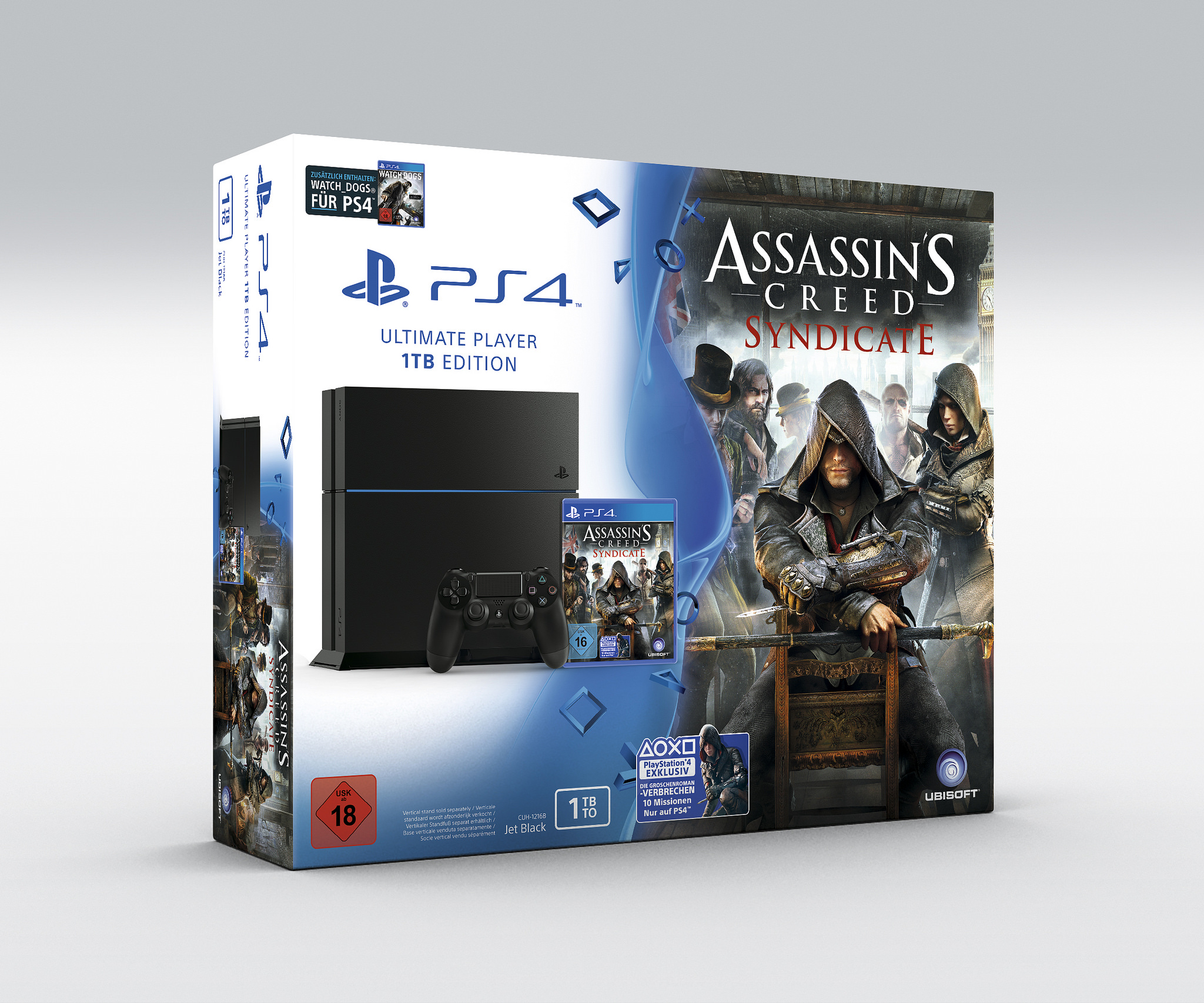 Pünktlich zum Start vom neuen Assassins Creed Spiel namens "Syndicate" bringen Sony und Ubisoft auch ein neues PS4 Bundle heraus. In dem Paket sind neben einer schwarzen PS4 Konsole mit 1TB HDD noch das Spiel auf Disc enthalten sowie "Watch Dogs" als digitaler Download.