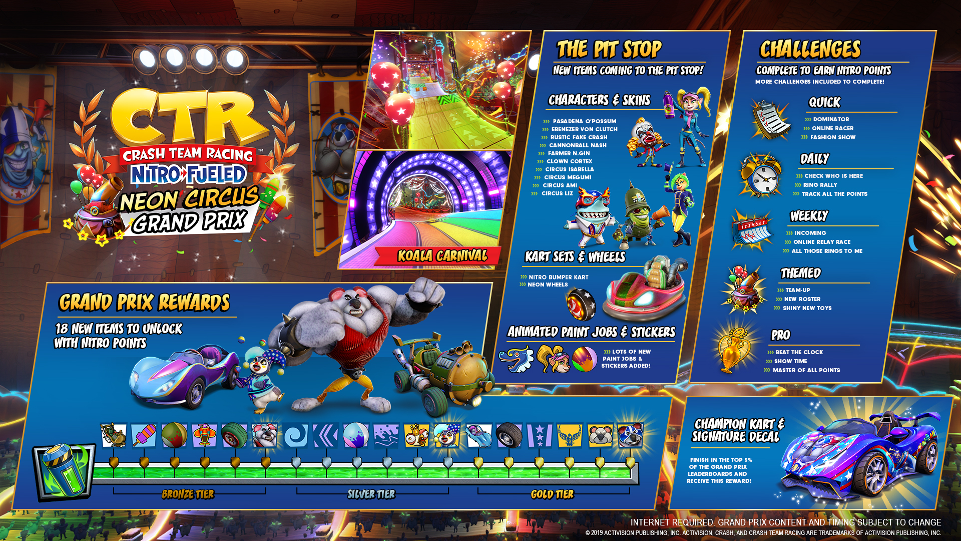Ab dem 08. November 2019 ist der Neon-Zirkus da! Also genauer gesagt, dann startet der neue Grand Prix in Crash Team Racing Nitro-Fueled. Der fünfte Grand-Prix bietet natürlich wieder eine neue Strecke "Koala-Karneval" und weitere Charaktere aus dem Crash-Universum, sowie neue Objekte und sogar einen neuen Spielmodus, in dem die Spieler ihr Können auf die Probe stellen dürfen. Ach ja und ein besonderes Federvieh glänzt mit einem königlichen Auftritt! Neue Karts sorgen wie immer für Nervenkitzel und mit vielen neuen Skins, Reifen, Applikationen, Stickern und animierten Lackierungen können die Spieler ihren kunterbunten Stil zur Schau stellen.