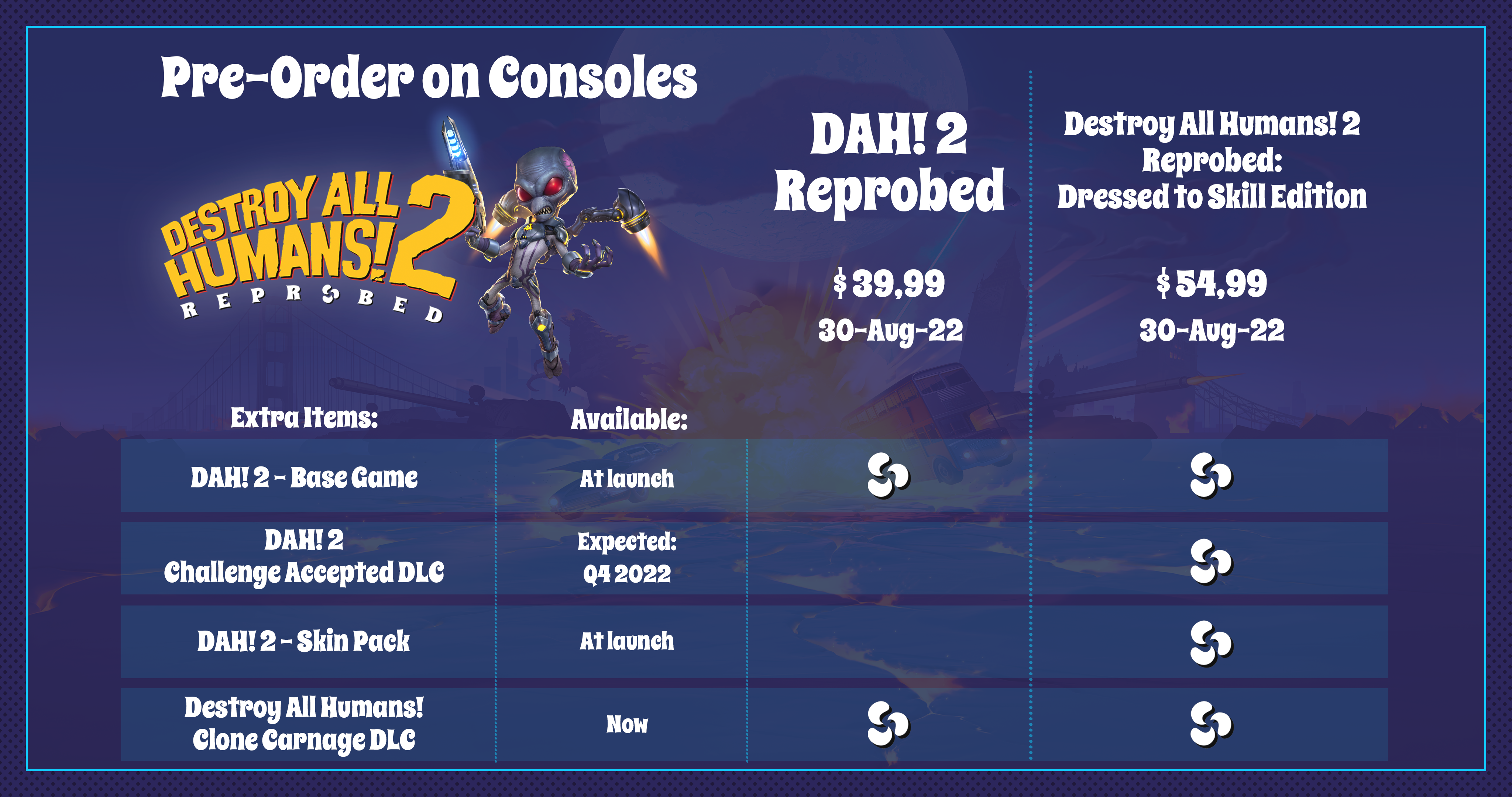Destroy All Humans 2! - Reprobed erscheint am 30. August 2022 für die PS5. Die UVP für die Standard-Edition liegt bei 39,99 €. Die "Dressed to Skill"-Edition ist für 54,99 € vorbestellbar.