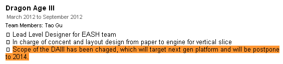 Zumindest wenn man einem chinesischen Level-Designer bei EA Shanghai Glauben will. Denn in dessen LinkedIn Profil steht, dass der Umfang des Spiels geändert wird, sich der Release dadurch auf 2014 verschiebt und man wohl die Next-Gen Konsolen ins Visier nimmt. EA hat derweil natürlich noch nichts Offizielles verlauten lassen.