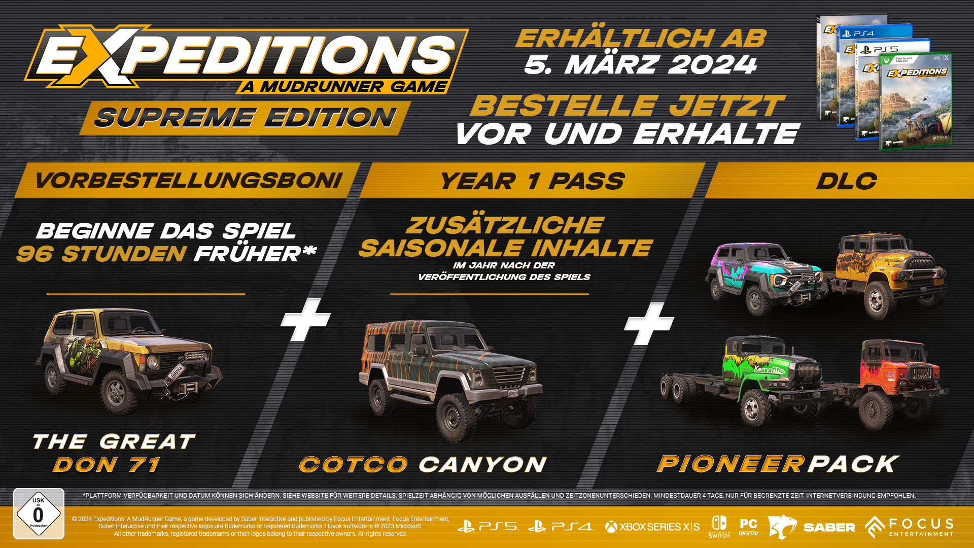 Bestellt jetzt die Supreme Edition, Year 1 Edition oder Standard Edition von Expeditions: A MudRunner Game vor und erhaltet exklusive Inhalte. Mit den Supreme und Year 1 Editionen erhält man außerdem 96 Stunden vor Veröffentlichung des Spiels einen Vorabzugang! Physische Versionen der Standard Edition können ebenfalls in ausgewählten Geschäften vorbestellt werden.