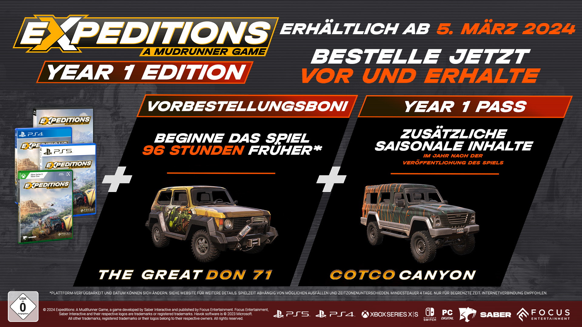 Expeditions: A MudRunner Game von Saber Interactive wird am 05. März 2024 für die PS4 & PS5 veröffentlicht. Vorbestellungen sind ab sofort möglich, damit sich eifrige Abenteurer ihren Platz an der Startlinie dieses bahnbrechenden Offroad-Erlebnisses sichern können.