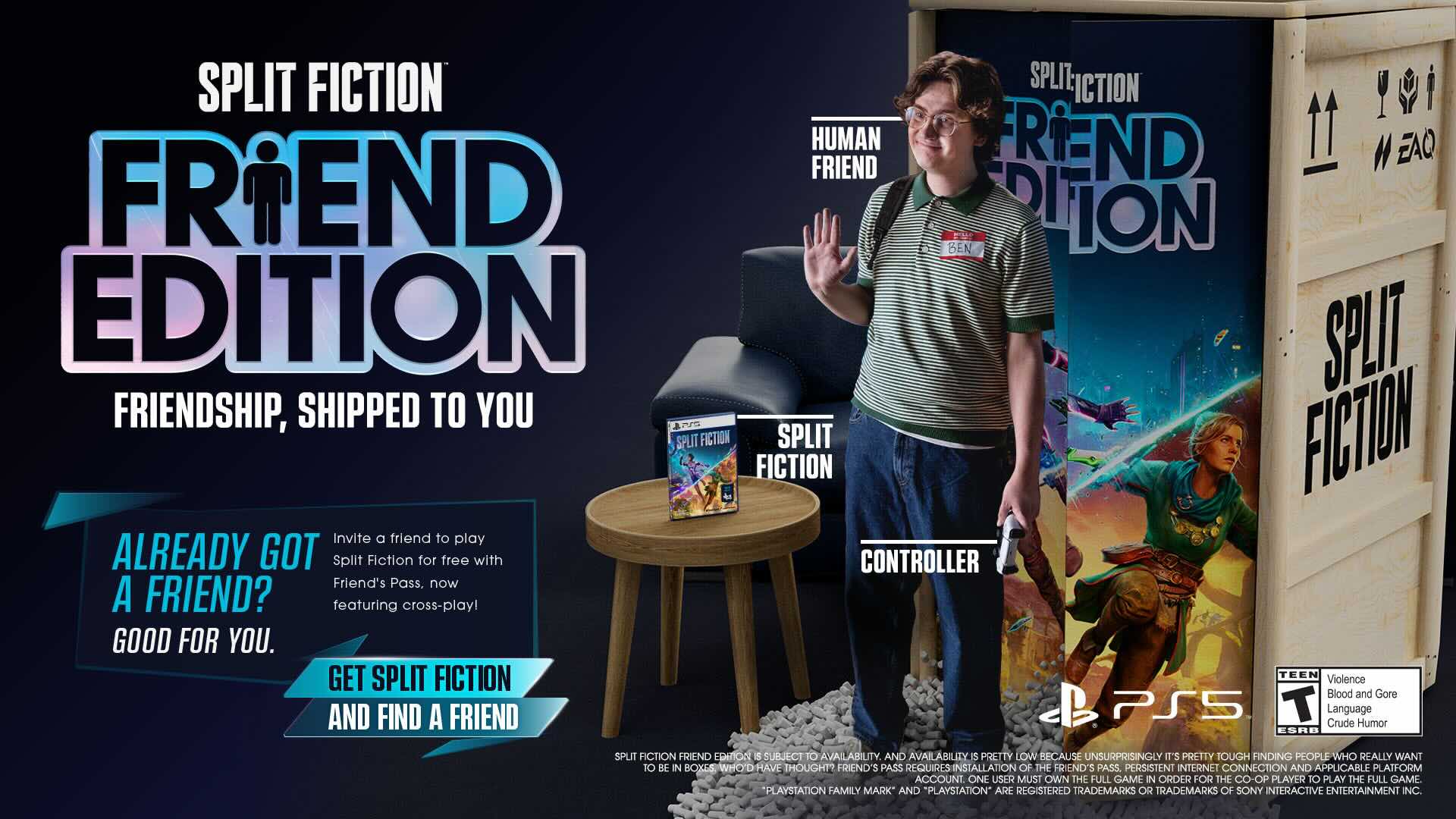 „Für mich als Gamer ist es eine richtig große Sache, Teil dieser unglaublichen Special Edition zu sein. Ich fühle mich geehrt, der erste echte Freund zu sein, der mit einem Spiel ausgeliefert wird“, erklärt Greg, einer der im Lieferumfang der Split Fiction: Friend Edition bestellbaren Begleiter. „Ein bisschen mulmig war mir schon, als Josef Fares meinte, ich solle in die Kiste steigen, aber sie ist geräumiger und gemütlicher, als sie aussieht. Ich freue mich darauf, die Welt zu bereisen und neue Freundschaften zu schließen. Ich habe Snacks dabei und bin bereit, mit einem großen High-Five aus der Kiste zu springen.“