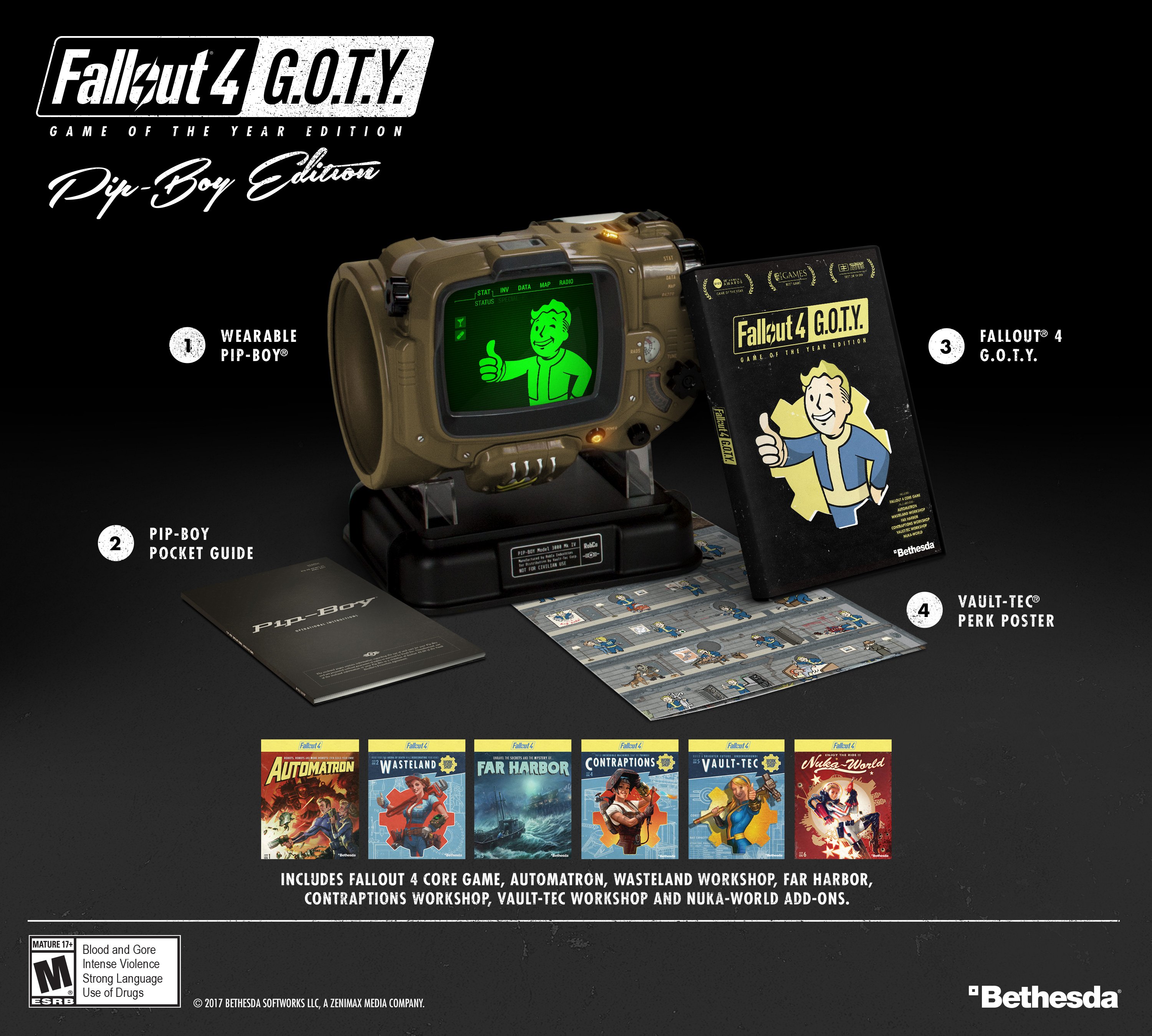 Bethesda hat nun Fallout 4 Game of the Year angekündigt. Wenig überraschend enthält diese Version das Hauptspiel und alle bislang erhältlichen Updates und Add-Ons. Erscheinen wird das Spiel übrigens schon am 26. September und wer damals beim Release die Pip-Boy Edition verpasst hat, bekommt nun die Möglichkeit dies nachzuholen. Denn auch die Game of the Year Edition erscheint in der Pip-Boy Edition zum Preis von 99,99$.
