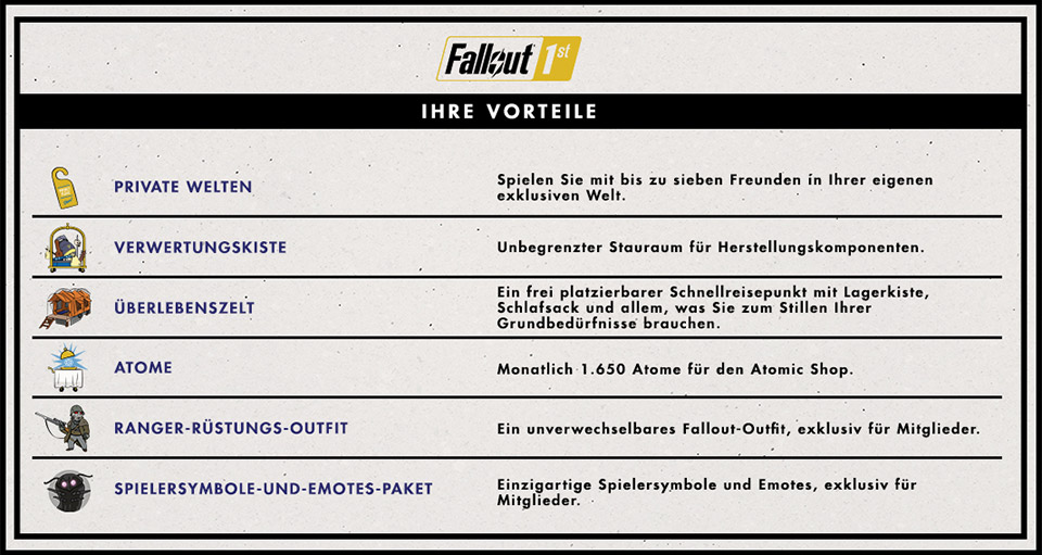 - privaten Welten: ihr könnte quasi euer privates Fallout 76 Spiel hosten und auswählen wer diese mit euch betreten kann. Ihr könnt 7 Leute einladen auch wenn die nicht Fallout 1st Mitglied sind, aber sobald ihr diese private Welt verlassen solltet fliegen alle raus die kein Fallout 1st Abo haben