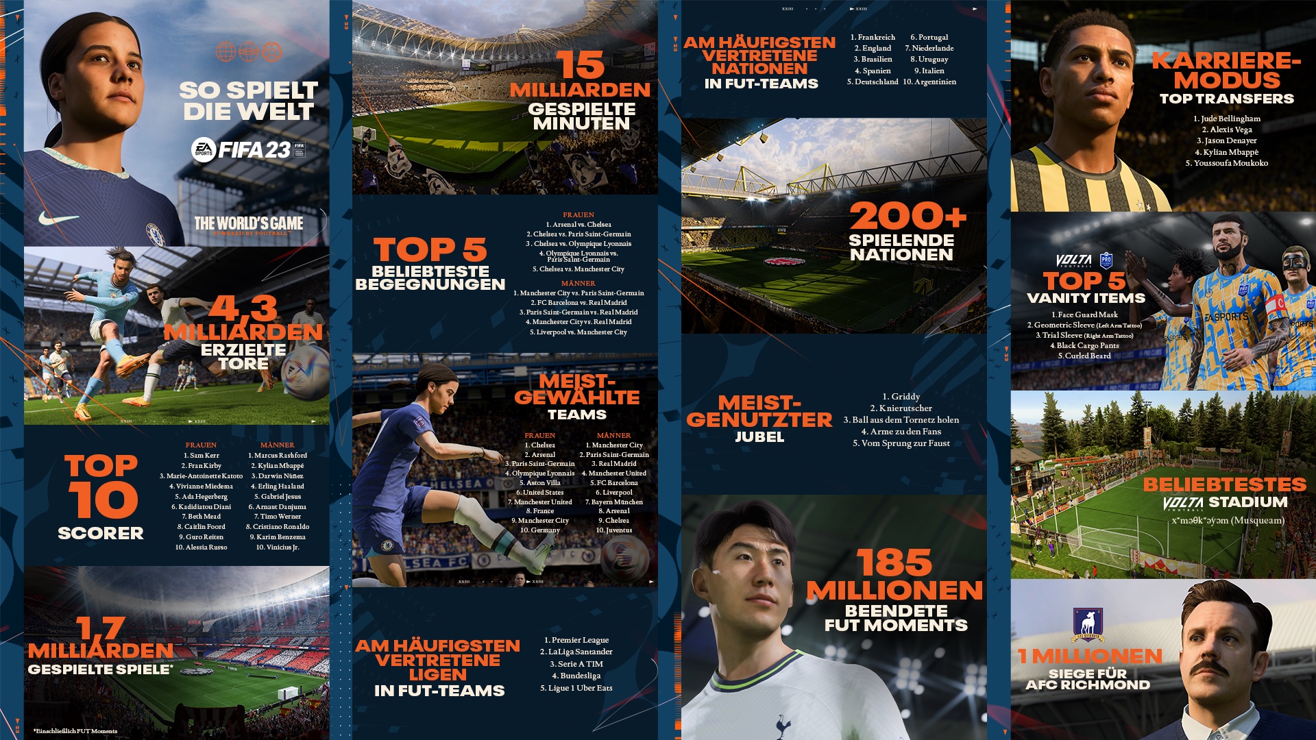 Im Karrieremodus stellt sich Jude Bellingham als begehrtester Spieler auf dem Transfermarkt heraus. Über 630.000 Spieler verpflichteten den Mittelfeldspieler von Borussia Dortmund für ihr Team. Die Spieler zeigen sich auch über die neue Integration ihres Lieblingsmanagers mit Schnauzbart, Ted Lasso, begeistert. Der AFC Richmond konnte in FIFA 23 bereits über 1 Million Spiele gewinnen.
