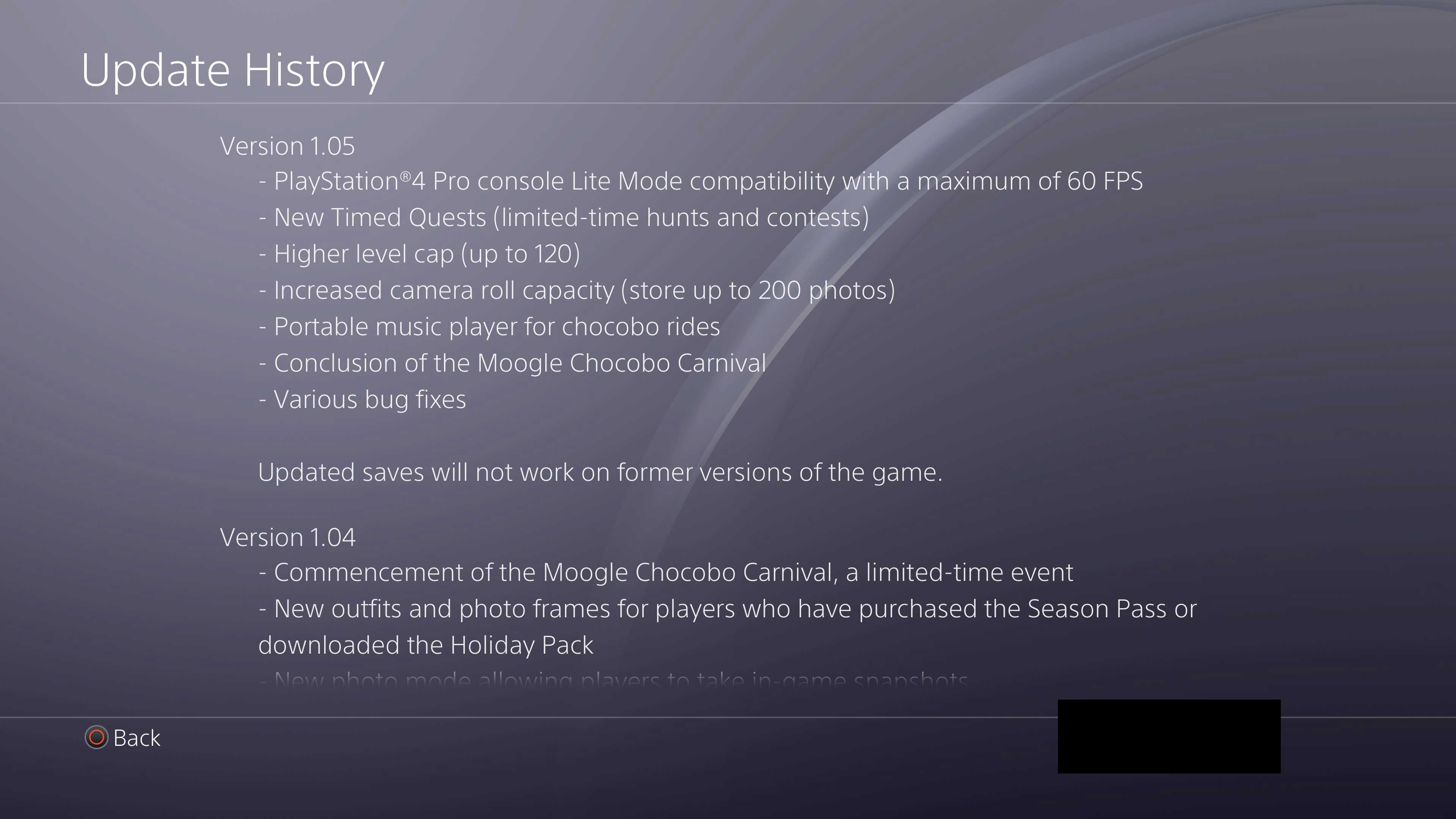 ACHTUNG: Spielstände mit 1.05 sind nicht mit früheren Versionen kompatibel. Wenn man einmal mit 1.05 gespeichert hat, kann man den Patch nicht mehr löschen und der ursprünglichen Version von FF XV nutzen.