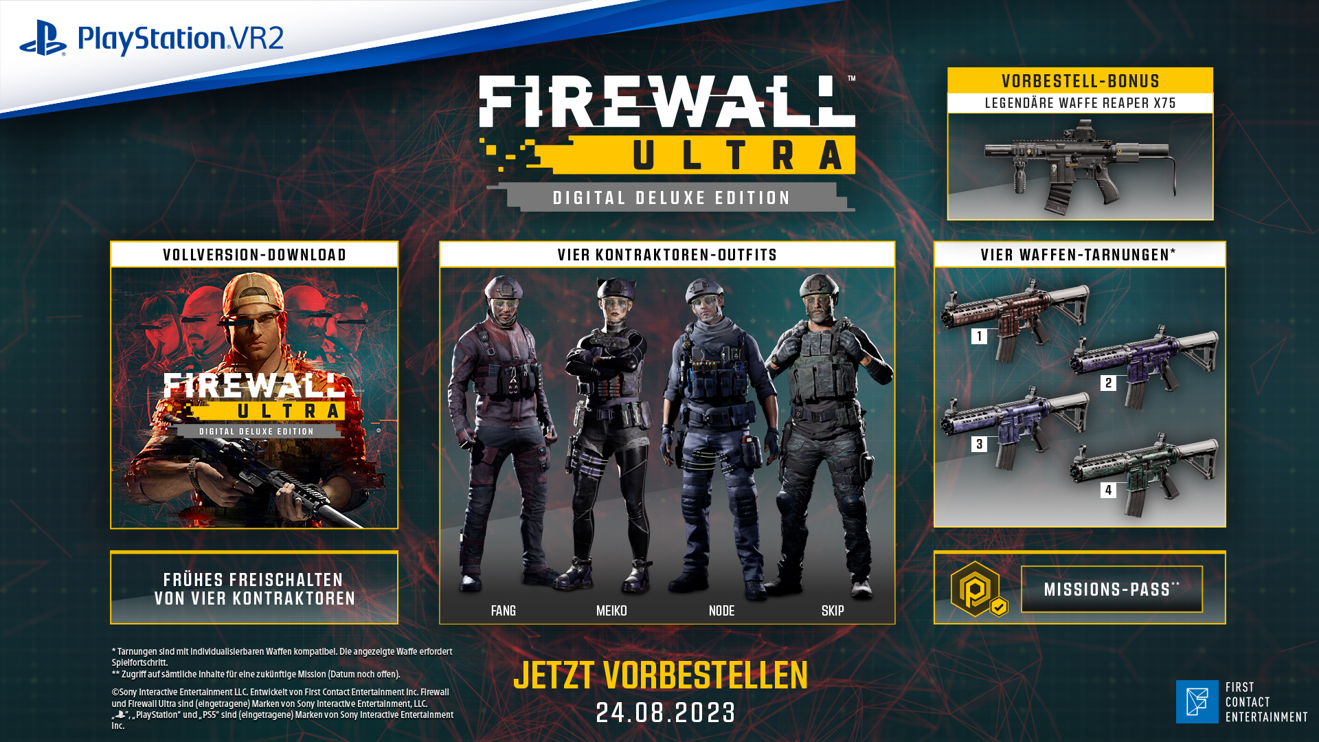 Neben der Standard Edition wird auch eine Digital Deluxe Edition von Firewall Ultra verfügbar sein. Die Deluxe Edition enthält neben den Inhalten der Standard Edition eine frühere Freischaltung von vier spielbaren Elitesöldnern, vier exklusive Outfits und vier Waffen-Designs, sowie den Operation Pass, der Zugang zu einer kommenden Operation gewährt. Vorbesteller erhalten zudem die legendäre Waffe Reaper X75. Diese ist sowohl in der Standard als auch in der Digital Deluxe Edition bei einer Vorbestellung enthalten.