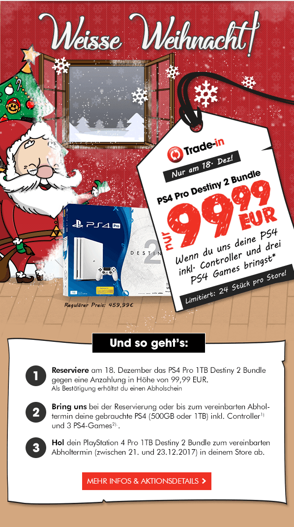 Gamestop hat vor Weihnachten mal wieder eine Trade-In Aktion für die PS4 Pro in petto. Für nur 99,99€ bekommt ihr eine nagelneue weiße PS4 Pro mit Destiny 2, wenn ihr morgen eine alte PS4 und drei Spiele in den Gamestop bringt.