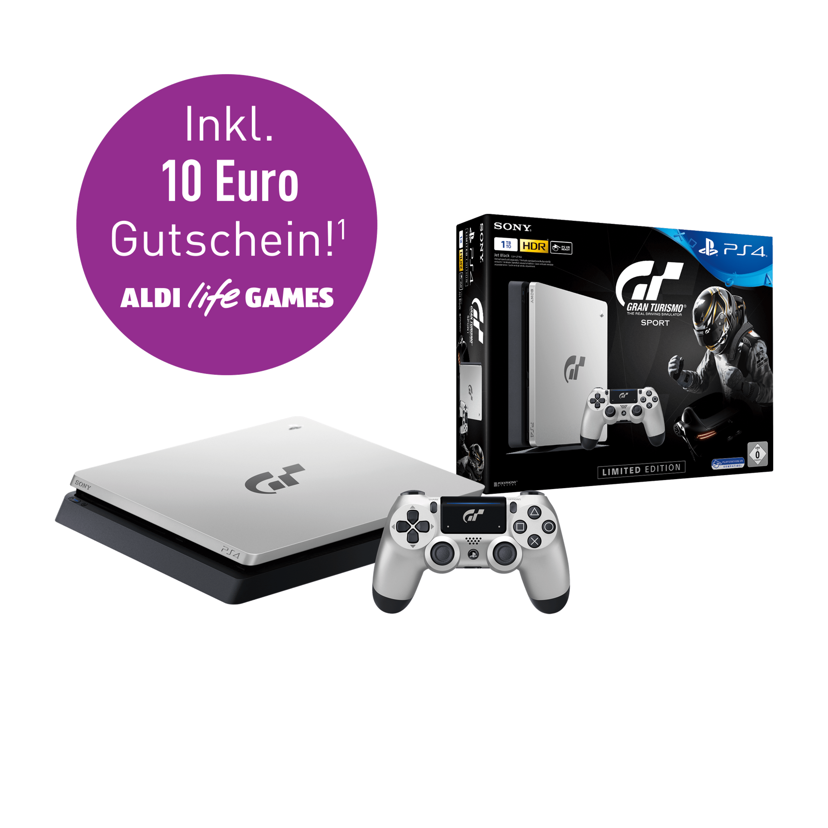 Und dann auch noch das: Ein wirkliches Schnäppchen ist das Bundle mit 299€ nicht. Neben einer normalen PS4 mit 1TB HDD gibt es noch einen Controller und Gran Turismo Sport (Day 1 Edition) dazu. Das Sky Supersport Monatsticket, Thats You und der 10€ Aldi Life Gameshop Gutschein dürfte sowieso die wenigsten interessieren. Was dagegen ärgerlich ist, nur bei Aldi gibt es die PS4 Konsole mit passendem Controller in dem schönen zweifarbigen Gran Turismo Look.