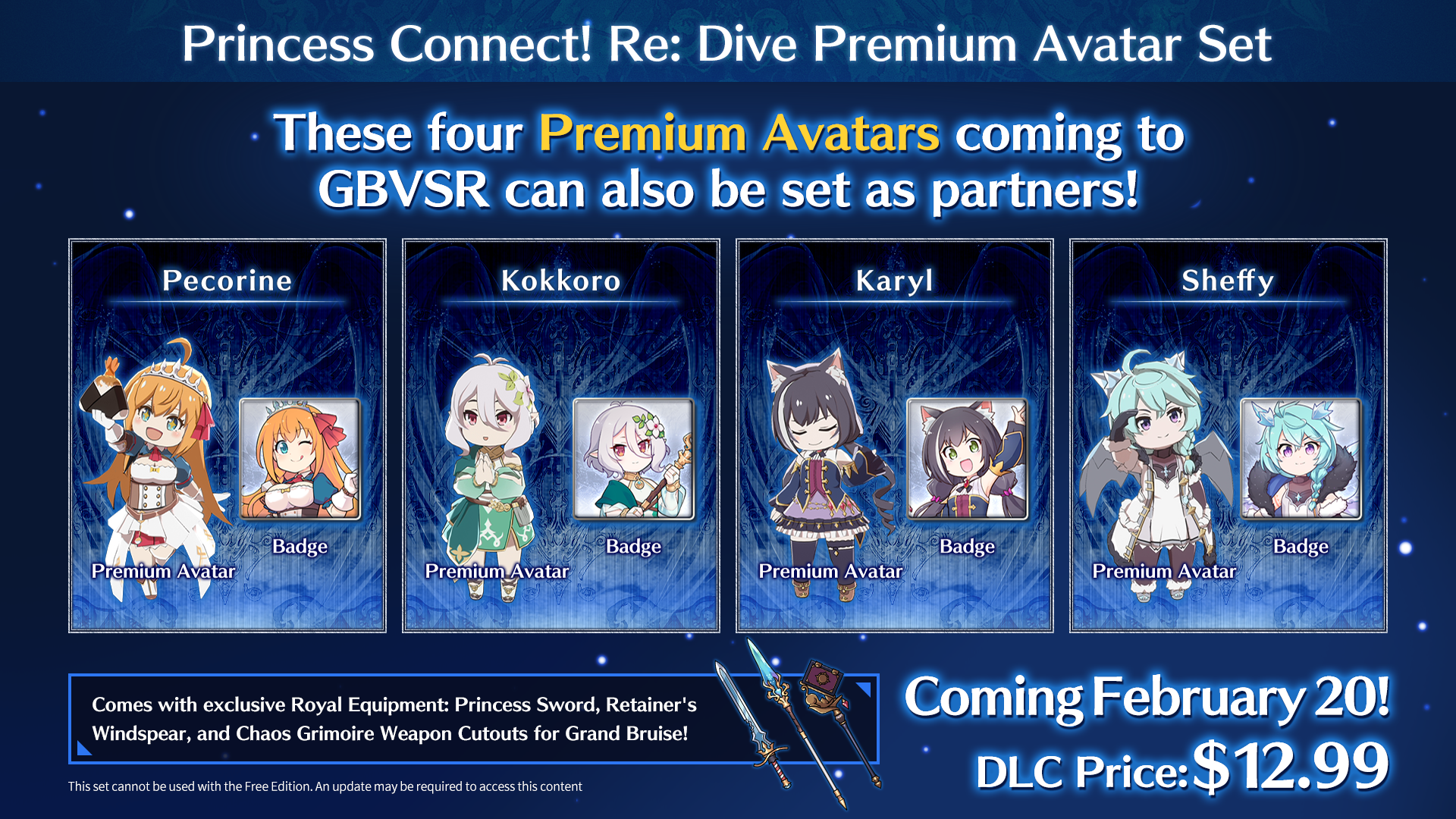 Das zweite Tie-in Premium Avatar-Set mit Prinzessin Connect! Re: Dive ist jetzt für 12,99€ erhältlich. Das Set zeigt Pecorine, Kokkoro, Karyl und Sheffy aus Princess Connect! Re: Dive und ist als kostenpflichtiger DLC erhältlich. Diese Premium-Avatare können auch als Partner eingestellt werden, die während des Spiels beraten und ermutigen. Das Set enthält außerdem Abzeichen und die königliche Ausrüstung: Princess Sword, Retainer’s Windspear und Chaos Grimoire Waffenausschnitte, die in Grand Bruise! verwendet werden können.