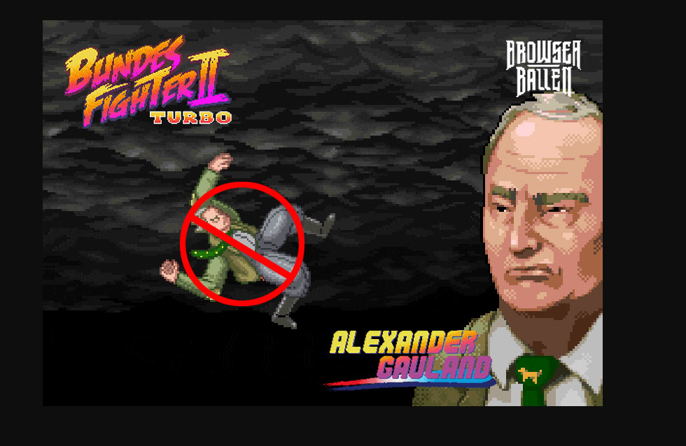 Aber warum der ganze Aufwand noch einmal? Ach ja, zur letzten Bundestagswahl gab es ein kostenfreies Browserspiel, bei dem verschiedene Parteienvertreter in einem 2D Beat`em Up namens Bundes Fighter II Turbo gegeneinander antraten. Das Ganz war als Satire gedacht und sollte junge Wähler dazu animieren, ihre Stimme abzugeben. Der virtuelle Alexander Gauland von der AfD konnte jedoch (siehe Bild) einen Special Move vollführen, der einem spiegelverkehrten Hakenkreuz verflixt ähnlich sah. Ein Mitglied des Verband für Deutschlands Video- und Computerspieler (VDVC) brachte das in Stuttgart zur Anzeige. Die Anwaltschaft sah jedoch von einer Einleitung eines Ermittlungsverfahrens ab, da es wohl keine gesetzliche Grundlage dazu gäbe. Schließlich sei das Spiel klar als Satire zu erkennen und wurde sogar durch den Öffentlich-Rechtlichen Rundfunk veröffentlicht.