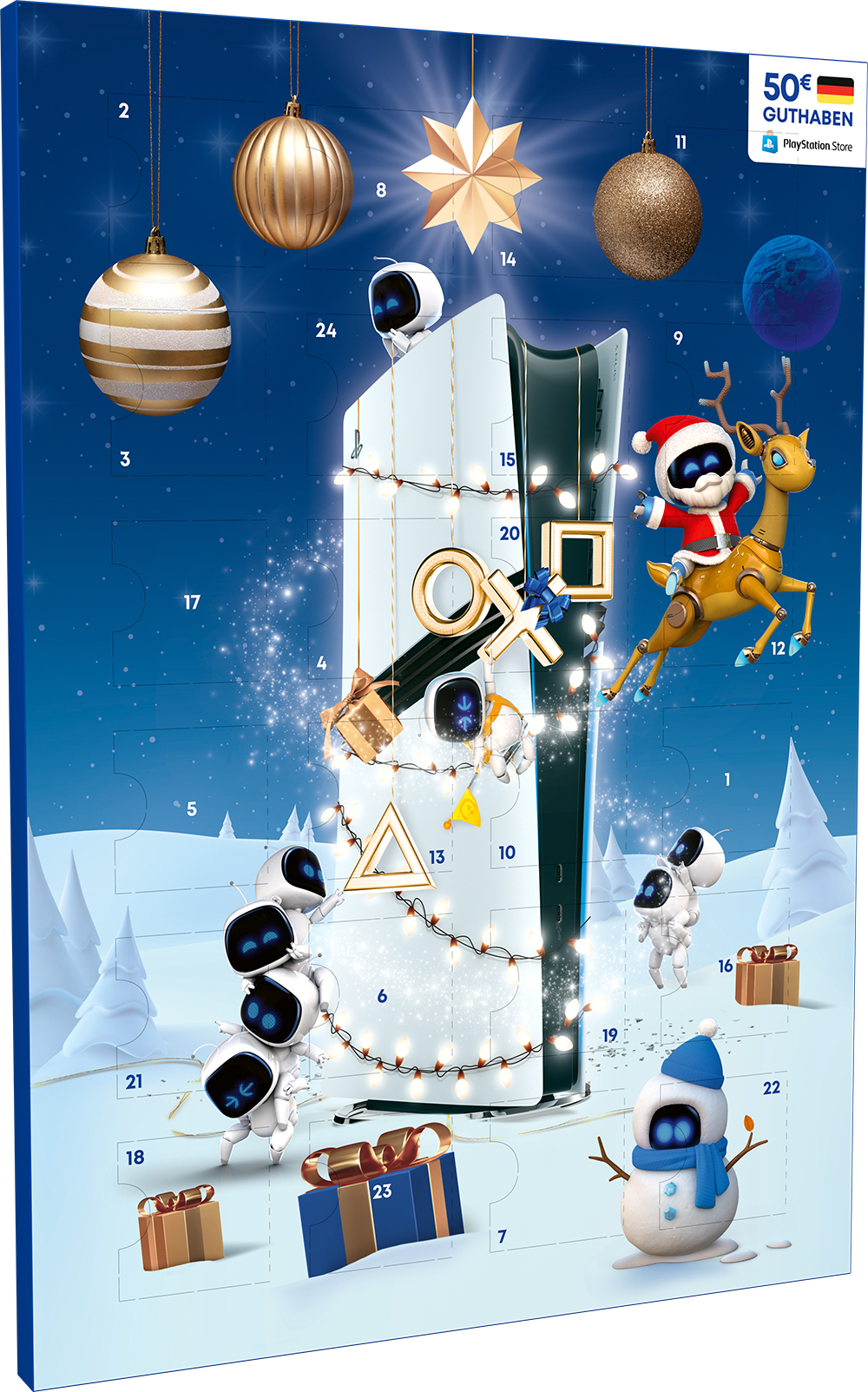 Die Weihnachtszeit naht und damit auch der diesjährige PlayStation-Guthaben-Adventskalender. Der liebevoll gestaltete Kalender ist zum Preis von 50 € bei teilnehmenden Handelspartnern erhältlich. Folgendes ist darin enthalten: