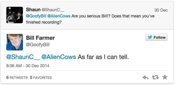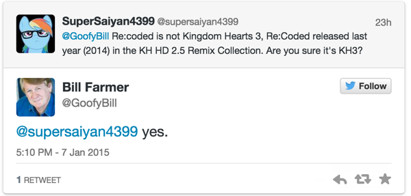 Denn der Synchronsprecher von Goofy, Bill Farmer, hat jetzt auf twitter bekannt gegeben, dass er mit den Arbeiten an der Synchronisierung fertig sei. Zudem wurde ihm aber mitgeteilt, dass Kingdom Hearts 3 noch dieses Jahr erscheinen soll. Hoffentlich irrt sich der gute Mann nicht.