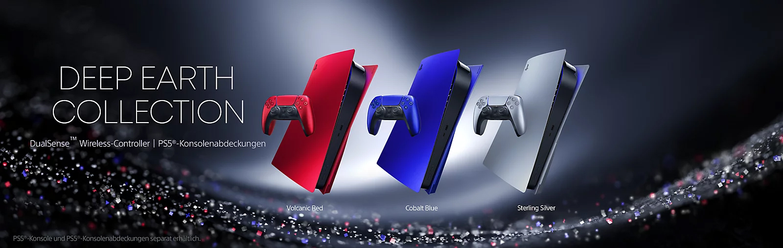 Als Erweiterung der PS5-Zubehörfamilie erscheint die Deep Earth Collection noch in diesem Jahr. Die Farbvarianten Volcanic Red, Cobalt Blue und Sterling Silver für DualSense Wireless-Controller und PS5 Konsolen-Cover können ab heute vorbestellt werden.