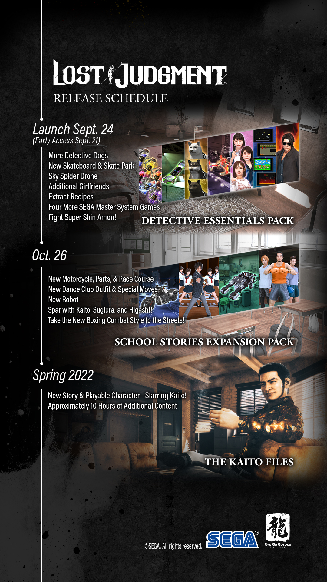Sega und das Ryu Ga Gotoku Studio stellten kürzlich die Roadmap für die digitalen Inhalte des kommenden Detektiv-Thrillers Lost Judgment vor. Lost Judgment kann bereits vorbestellt werden und ist ab dem 24. September 2021 für die PS5 sowie die PS4 erhältlich.