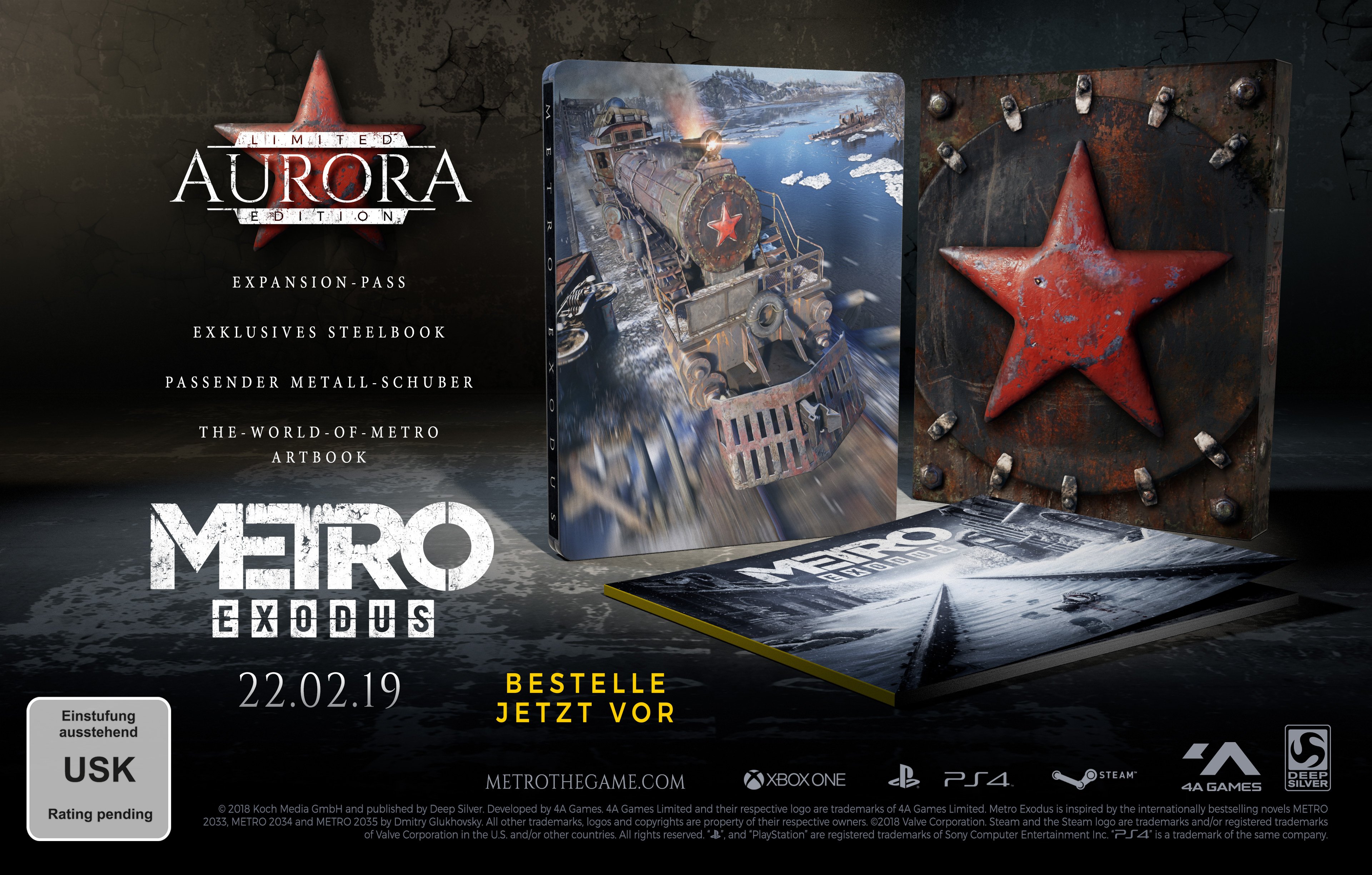 Die Aurora-Limited-Edition ist für die Vorbesteller der physischen Handelsversion von Metro Exodus verfügbar und beinhaltet das Hauptspiel Metro Exodus, ein exklusives Steelbook, ein „The World of Metro“-Artbook und Zugang zum Season-Pass – all das gehüllt in eine zusätzliche Metall-Hülle, inspiriert von der „Aurora“. Käufer des Spiels für die PS4 erhalten zusätzlich ein dynamisches Metro-Theme.