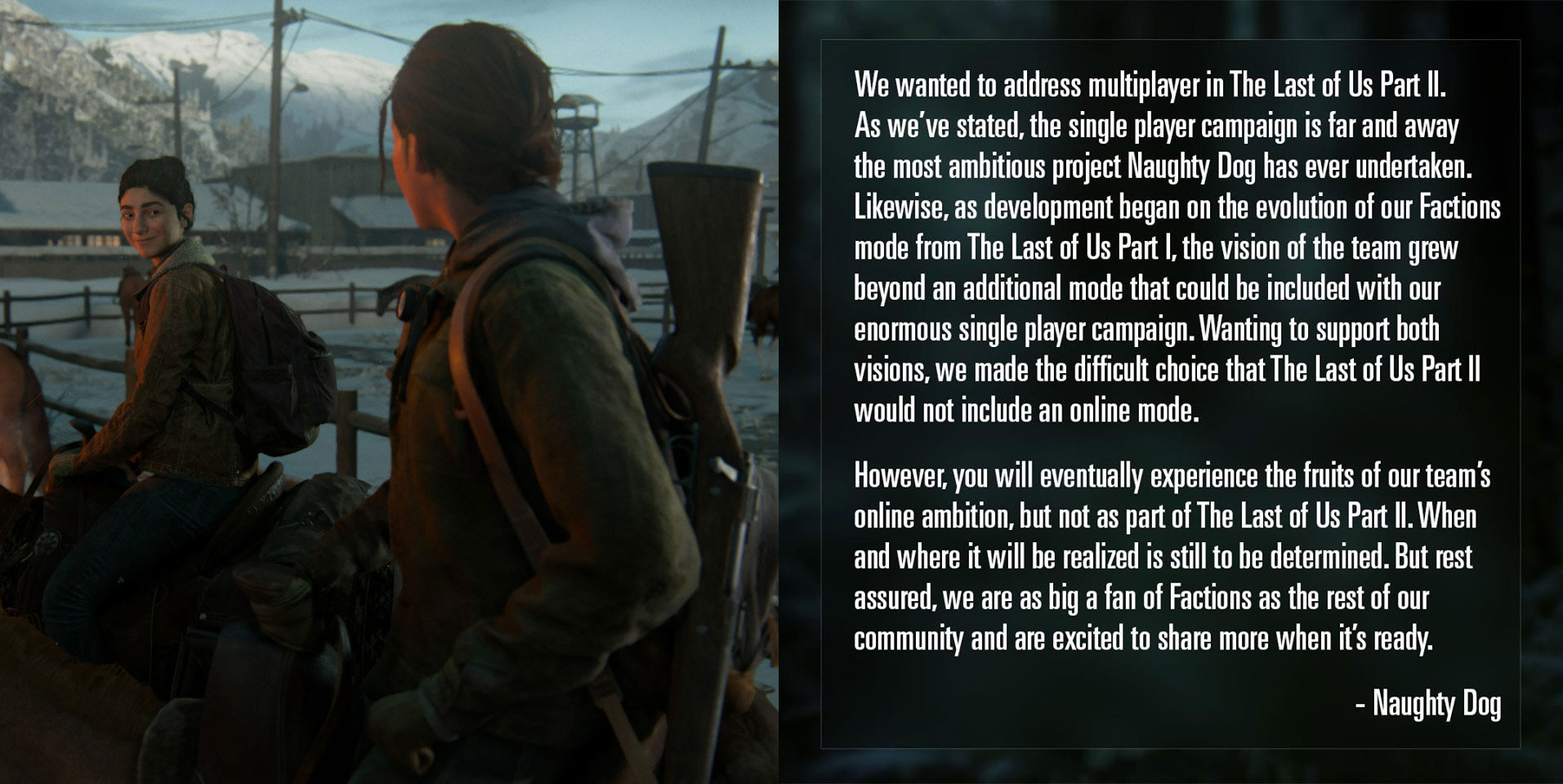Die Einzelspielerkampgane von The Last of Us Part II ist das bislang größte Unterfangen in der Geschichte von Naughty Dog. Gleichzeitig wurde auch am Mehrspieler-Fraktions-System aus dem Vorgänger getüftelt. Das wuchs jedoch über einen zusätzlichen Spielmodus zur Kampagne heraus. Um beide Visionen entsprechend zu unterstützen wurde die schwere Entscheidung getroffen, dass der Titel über keinen Multiplayer-Modus verfügen wird.