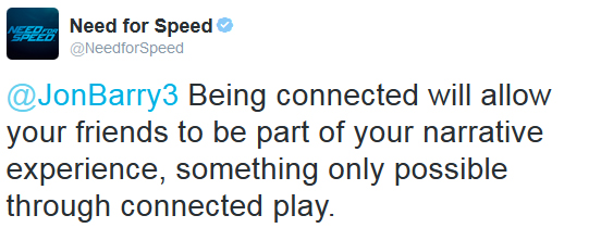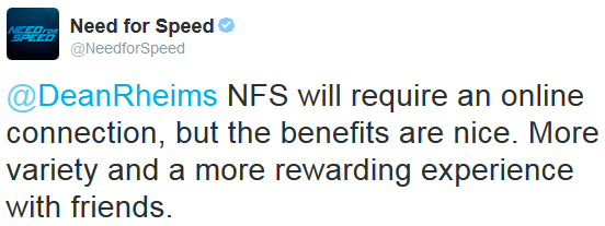 Wie nun per twitter von EA bzw. den Entwicklern bekannt gegeben wurde, wird das erst kürzlich angekündigte Need for Speed eine Internetverbindung zum Spielen voraussetzen. Dies hätte jedoch Vorteile laut den Entwicklern, sodass man ein abwechslungsreicheres Spielerlebnis erhält und die spielenden Freunde können so ins Spielgeschehen integriert werden.