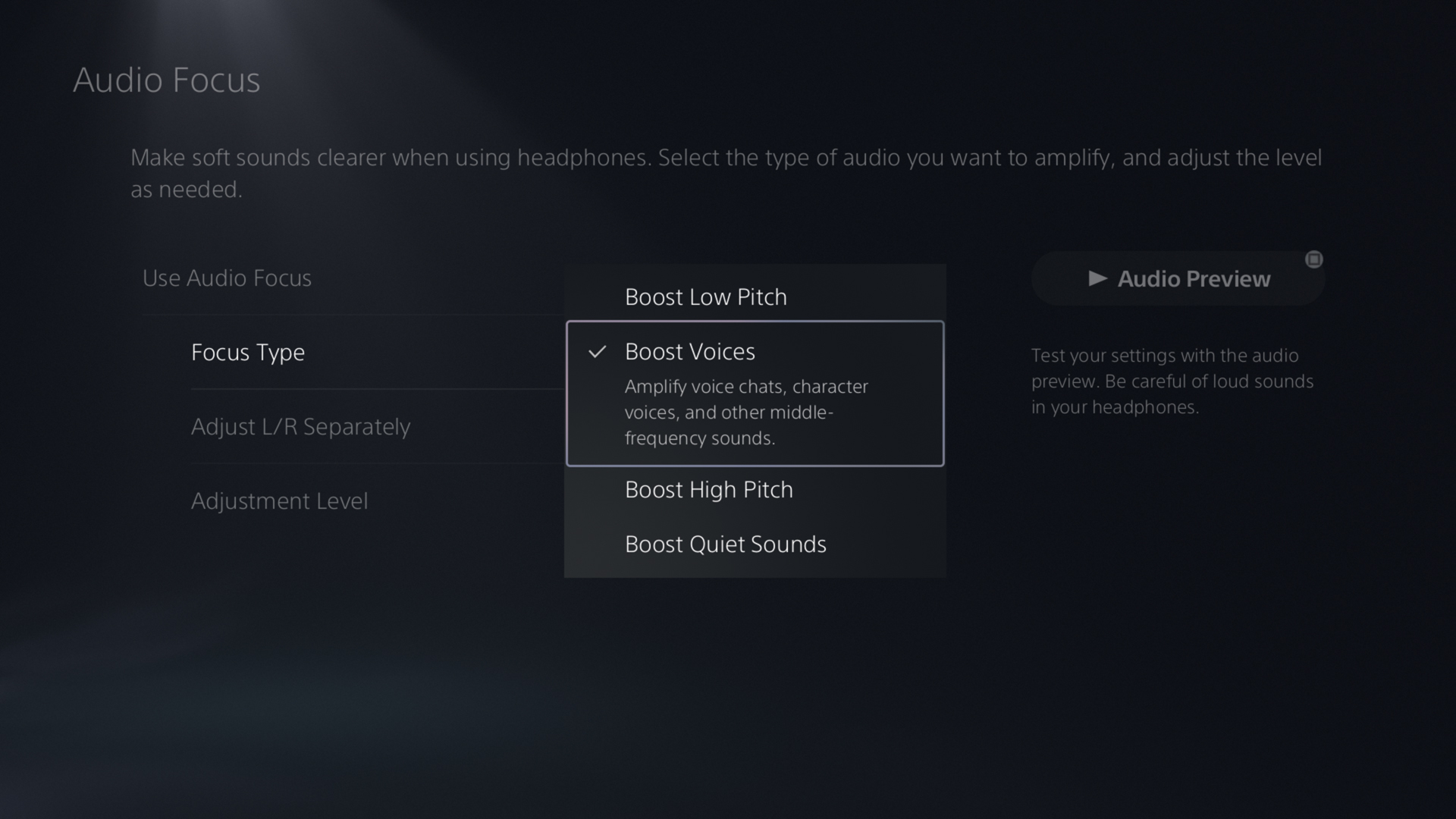Wenn die Audio-Fokus-Einstellung aktiviert ist, können Sie aus einer Reihe von voreingestellten Optionen wählen, die es einfacher machen, Geräusche wie Dialoge von Spielfiguren, subtile Soundeffekte wie Schritte und raschelndes Gras sowie Stimmen in Gruppenchats zu unterscheiden, um ein intensiveres Spielerlebnis zu ermöglichen.