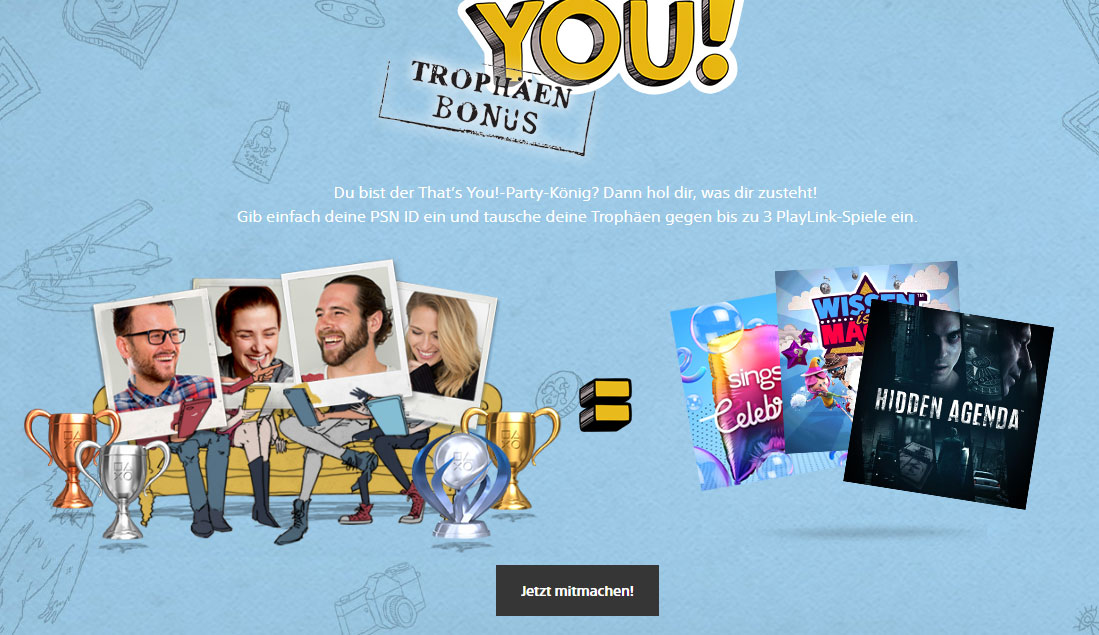 Sony hat zur Zeit und bis Ende des Jahres eine coole Aktion laufen. Sammelt Trophäen im Play-Link Titel That`s You (den gibt es aktuell kostenlos im PS Plus Abo) und ergattert damit weitere Play-Link Spiele wie Hidden Agenda, Wissen ist Macht und Singstar Celebration. Aber Achtung: Pro PSN-Namen ist die Aktion nur einmal möglich, sprich, wollt ihr alle Play-Link Spiele, dann müsst ihr die dafür benötigten Trophäen sammeln und dann mit einem Mal einlösen.