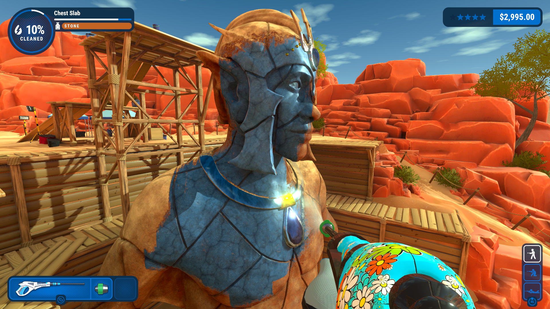 Die Spieler erinnern sich vielleicht an Jobs in der Mauka-Aitu-Wüste, bei denen sie eine antike Statue, ein beeindruckendes Monument und eine alte Dampflok gereinigt haben. Hier gibt es nicht nur alte Relikte, sondern neuerdings auch fortschrittliche Technologie – nämlich die Solarstation und eine riesige Satellitenschüssel. Es ist eure Aufgabe, den ganzen Sand wegzuspülen und alles glänzen zu lassen.