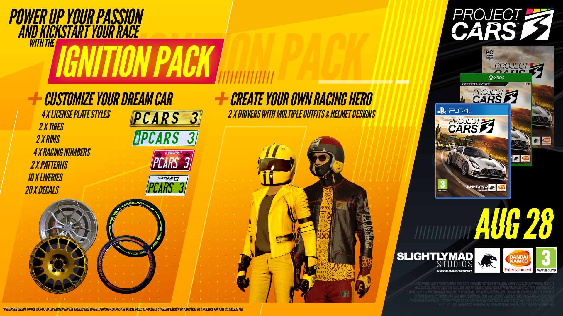 Vorbesteller erhalten das „Ignition Pack“, das einen kompletten Bausatz enthält, mit dem sie ihre Rennhelden und das Auto ihrer Träume gestalten können. Das „Ignition Pack“ enthält: