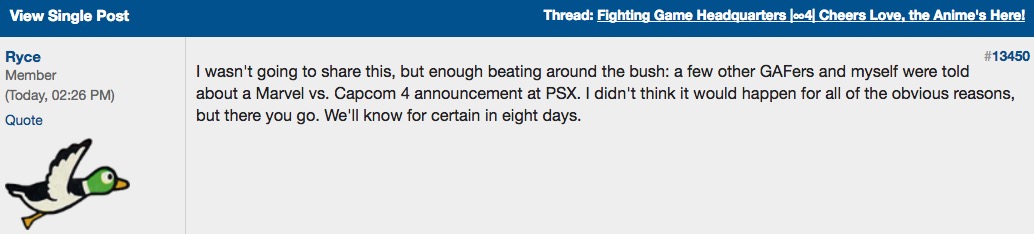 Laut einem User, der bis dato noch nicht gebannt wurde (und damit laut admins zumind. Quellen in der Branche hat), wird auf der PSX Marvel vs Capcom 4 vorgestellt.
